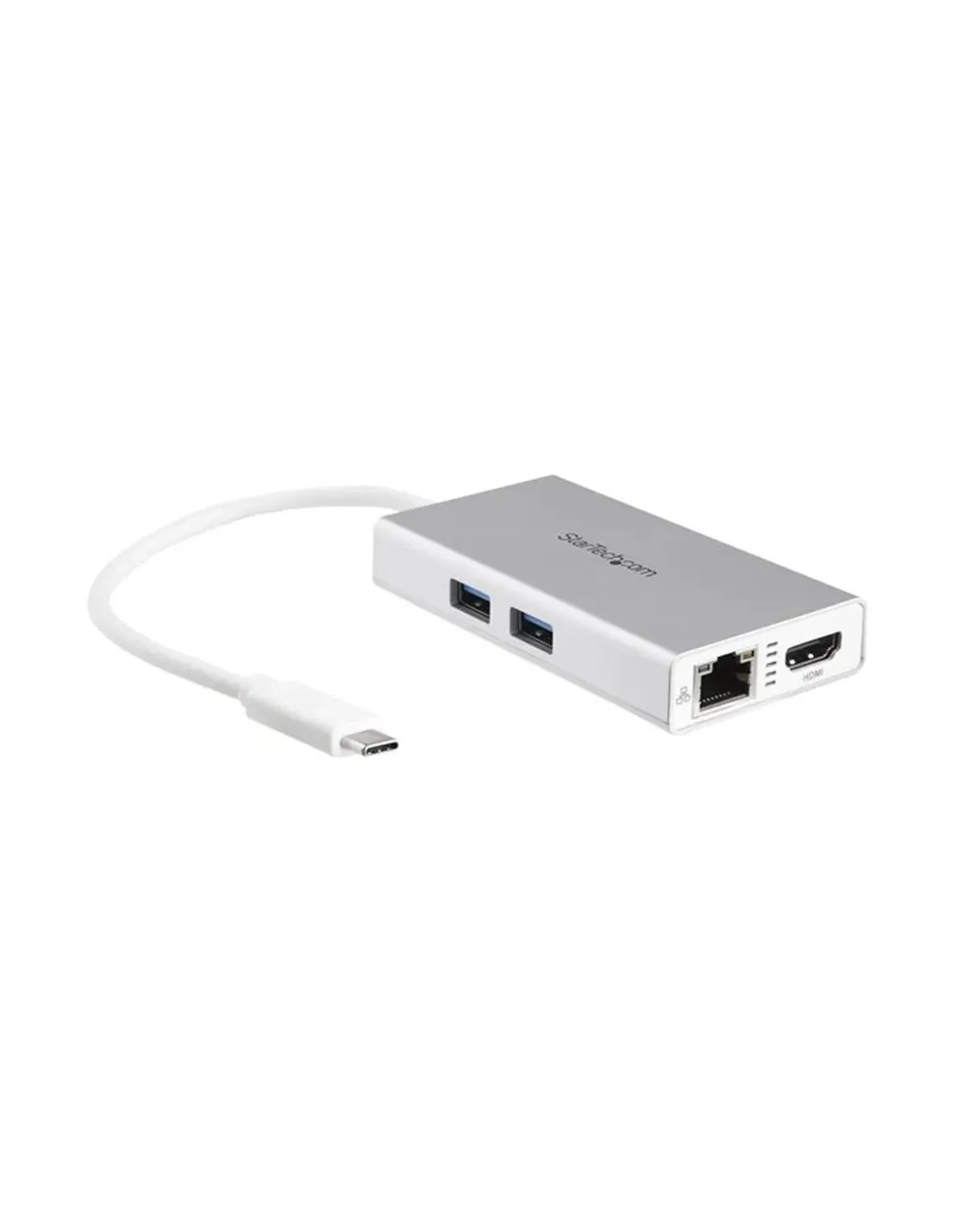 Características del StarTech.com Adaptador Multipuertos USB-CEl **adaptador multipuertos USB-C de StarTech.com** es una solución compacta y eficiente para quienes necesitan ampliar la conectividad de su portátil o dispositivo compatible. Diseñado con un enfoque profesional, este hub permite conectar periféricos, pantallas externas, redes y cargar tu equipo desde un solo puerto USB-C. Ideal para entornos de oficina, teletrabajo o uso en movilidad, combina **versatilidad, diseño compacto y fiabilidad**.Conectividad total desde un solo puertoEste adaptador actúa como una estación de conexión completa gracias a su variedad de interfaces, permitiendo trabajar de forma eficiente sin sacrificar movilidad. Además, soporta **Power Delivery de hasta 60W**, lo que significa que puedes cargar tu portátil mientras usas los demás puertos.1 puerto USB-C 3.1 Gen 1 con Power Delivery (60W)2 puertos USB 3.0 Tipo A para periféricos1 puerto HDMI compatible con resoluciones 4K1 puerto RJ-45 Gigabit EthernetResolución 4K y conexión de red estableLa salida HDMI del adaptador permite conectarse a monitores externos con resolución **hasta 4096 x 2160 píxeles**, ideal para presentaciones, productividad o uso multimedia. Además, su puerto Ethernet garantiza una conexión de red rápida y estable, incluso cuando el WiFi no es una opción fiable.Salida HDMI hasta 4K (4096 x 2160 a 24 Hz / 3840 x 2160 a 30 Hz)Puerto de red 10/100/1000 Mbps (Gigabit Ethernet)Compatible con Wake on LAN y MDIX automáticoDiseño compacto y listo para llevarCon un diseño ligero y elegante en blanco y plata, este adaptador cabe fácilmente en cualquier bolsa o mochila. Su cable USB-C integrado de 25 cm facilita la conexión directa sin necesidad de accesorios adicionales. Está construido con carcasa de plástico resistente y cumple con estándares como **RoHS y FCC**.Dimensiones: 9.6 cm x 5.1 cm x 1.6 cmPeso: 64 gCable USB-C integrado de 25 cmAmplia compatibilidad y garantía de confianzaEste adaptador funciona sin problemas con una amplia gama de sistemas operativos, desde **Windows** hasta **macOS y Chrome OS**, sin necesidad de instalar drivers adicionales. Además, cuenta con una garantía limitada de **3 años**, respaldando su calidad y fiabilidad.Compatible con Windows 7/8/10/11, macOS 10.9 o superior, Chrome OSPlug & Play sin instalación de driversGarantía limitada de 3 añosOtras especificacionesCompatible con TAAEntrega de energía: Power Delivery 2.0Estándares soportados: USB 3.1 Gen 1, USB 3.0, USB 2.0, IEEE 802.3, UASPNormativas: RoHS, FCC, USB Attached SCSI Protocol (UASP)