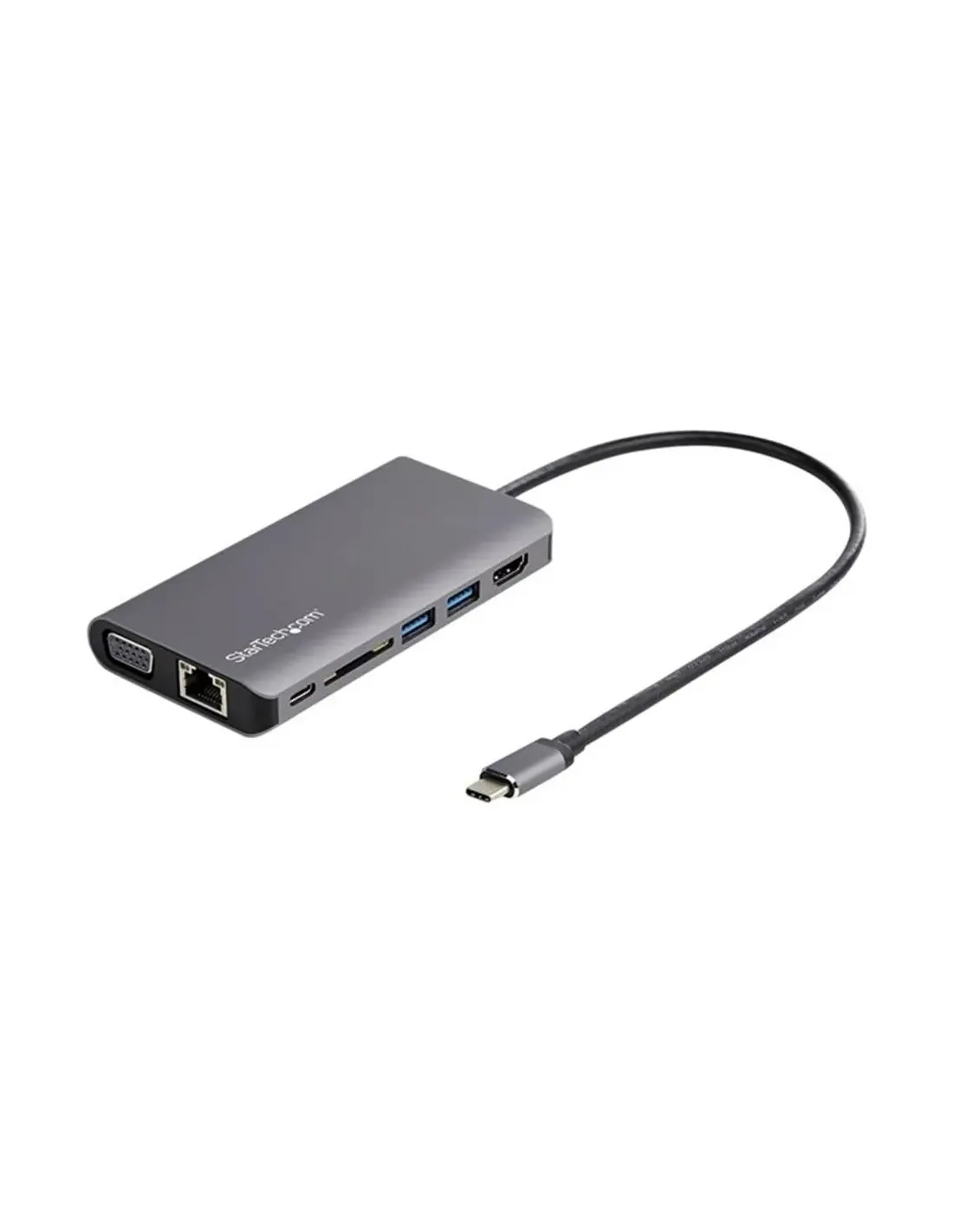 Características del StarTech.com Adaptador Multipuertos USB-C con HDMI o VGA y Cable de Conexión LargoEl **adaptador multipuertos USB-C de StarTech.com** es una solución versátil y compacta para quienes necesitan ampliar la conectividad de su portátil o tablet con puerto USB-C. Diseñado para entornos profesionales, educativos o de movilidad, este dispositivo permite conectar pantallas externas, periféricos USB, redes Ethernet y tarjetas SD, todo desde un único puerto. Su **cable integrado de 30 cm** facilita su uso incluso en configuraciones de escritorio con acceso limitado a puertos.Conectividad completa desde un solo puerto USB-CCon este adaptador, puedes transformar un solo puerto USB-C en una estación de trabajo funcional. Ofrece salidas de vídeo tanto HDMI como VGA, permitiendo conectar monitores, proyectores o televisores según tus necesidades.Salida HDMI compatible con resoluciones hasta 4K Ultra HD (4096 x 2160 a 24 Hz)Puerto VGA para conexiones analógicas (hasta 3440 x 1440 a 60 Hz)Puerto Ethernet RJ-45 para redes Gigabit (10/100/1000 Mbps)Puertos adicionales para periféricos y energíaEl adaptador incluye puertos USB y lector de tarjetas que facilitan la conexión de periféricos, almacenamiento externo y alimentación de dispositivos. Además, admite carga de hasta 100 W vía Power Delivery.2 puertos USB 3.1 Gen 1 Tipo A (hasta 5 Gbps)1 puerto USB-C con Power Delivery 3.0 (100 W)Lector de tarjetas SD integradoConector combinado de audio/micrófono de 3,5 mm (4 polos)Diseño compacto, materiales resistentesCon acabados en color negro y gris espacio, este adaptador presenta un diseño sólido y discreto. Su cable integrado de 30 cm proporciona flexibilidad para colocarlo donde más convenga, y su tamaño compacto permite transportarlo fácilmente.Dimensiones: 11,6 x 6 x 1,5 cmPeso: 114 gCumple con normativas FCC, RoHS y REACHCompatibilidad universalFunciona con una amplia gama de sistemas operativos, incluyendo versiones modernas de Windows, macOS, Chrome OS, iOS y Android, garantizando una experiencia plug-and-play en la mayoría de entornos de trabajo.Compatible con Windows 7 / 8 / 8.1 / 10 / 11Compatible con macOS desde 10.11 hasta Ventura 13.0Compatible con Google Chrome OS, iOS y AndroidGarantía y fiabilidadStarTech.com respalda este adaptador con una garantía limitada de 3 años, asegurando un rendimiento fiable y duradero en el tiempo.Otras especificacionesResoluciones soportadas: 3840 x 2160 a 30 Hz / 3440 x 1440 a 60 Hz / 4096 x 2160 a 24 HzTemperatura de funcionamiento: de 0 °C a 45 °CDimensiones del embalaje: 17 x 14,2 x 3 cm