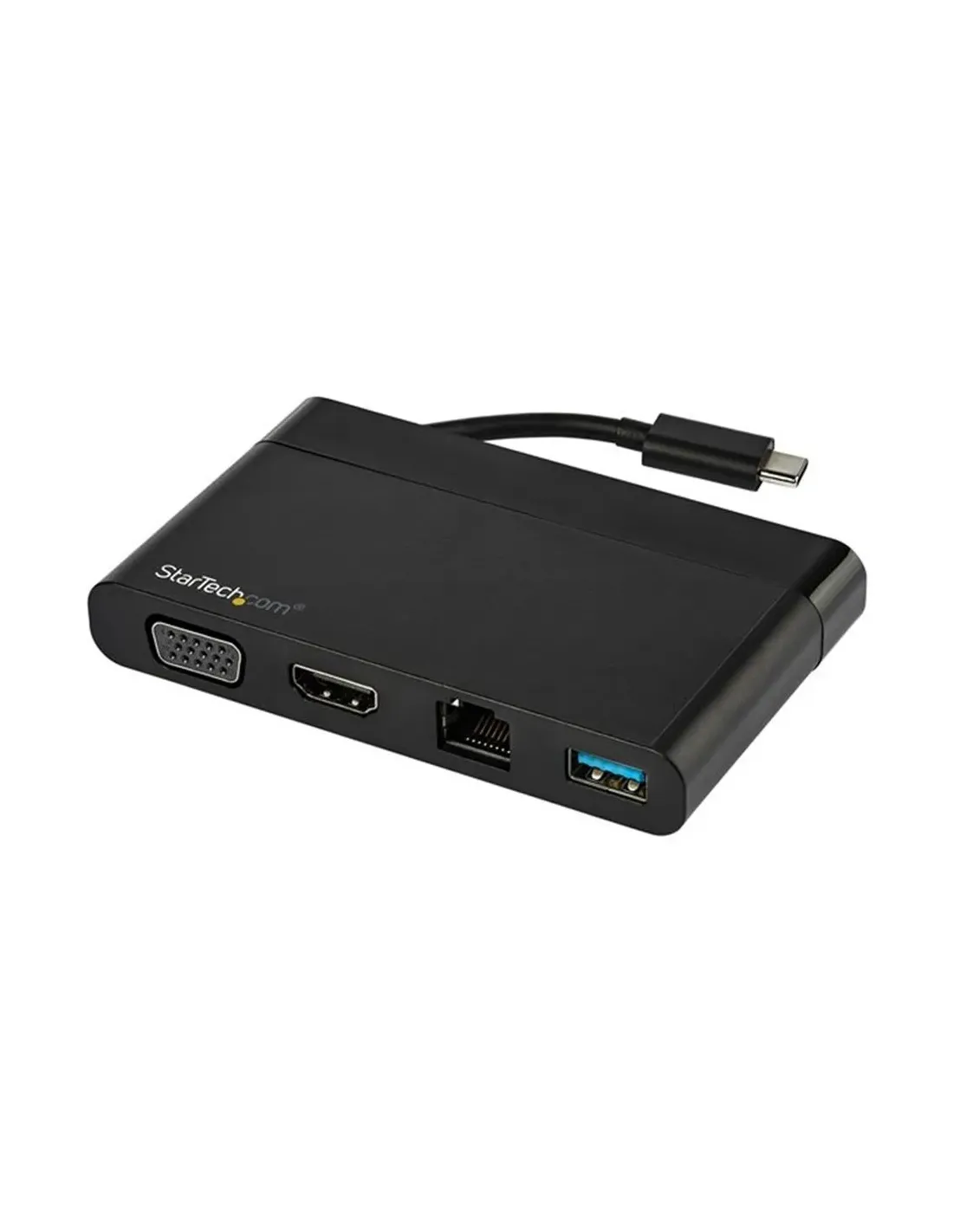 Características del StarTech.com Adaptador Multipuertos USB-C 4K con HDMI y VGAEl **adaptador multipuertos USB-C de StarTech.com** es una solución compacta y versátil para profesionales que necesitan ampliar la conectividad de sus dispositivos portátiles. Diseñado para portátiles, ultrabooks y tablets con puerto USB-C, permite conectar simultáneamente salidas de vídeo HDMI o VGA, red Ethernet, periféricos USB y audio, todo a través de un solo cable. Ideal para entornos de oficina, presentaciones o estaciones de trabajo móviles.Conectividad ampliada en un solo adaptadorEste dispositivo ofrece una amplia gama de conexiones esenciales que te permiten transformar tu puerto USB-C en un completo centro de conectividad. Compatible con una amplia variedad de sistemas operativos y sin necesidad de drivers, es una opción plug-and-play perfecta para mejorar tu productividad.1 salida HDMI (hasta 4096 x 2160 a 24 Hz / 3840 x 2160 a 30 Hz)1 salida VGA (hasta 1920 x 1200 a 60 Hz)1 puerto USB 3.0 Tipo A1 puerto Ethernet RJ-45 GigabitDiseño compacto y portátilCon un diseño ligero y delgado, este adaptador es ideal para llevar en cualquier maletín o mochila sin ocupar espacio. Su cable USB-C está integrado y tiene una longitud de 8,5 cm, lo que facilita su conexión rápida en cualquier entorno de trabajo.Dimensiones: 10.5 cm x 6.5 cm x 1.6 cmPeso: 82 g (200 g con embalaje)Color: NegroCompatibilidad universal y alimentación USBFunciona con sistemas Windows, macOS y Chrome OS sin necesidad de instalar controladores adicionales. Además, se alimenta directamente a través del puerto USB-C, eliminando la necesidad de fuentes externas.Compatible con Windows 7 a 11, macOS X 10.11 en adelante, Chrome OSAlimentación por USB-CCompatible con protocolos Ethernet, Fast Ethernet y Gigabit EthernetCalidad garantizadaEste adaptador cumple con los estándares de calidad y seguridad más exigentes. Incluye una garantía limitada de 3 años por parte del fabricante.Certificaciones: FCC, RoHS, UASPGarantía limitada: 3 añosOtras especificacionesProtocolos de red soportados: IEEE 802.3, IEEE 802.3u, IEEE 802.3abIncluye cable USB-C integrado (8,5 cm)