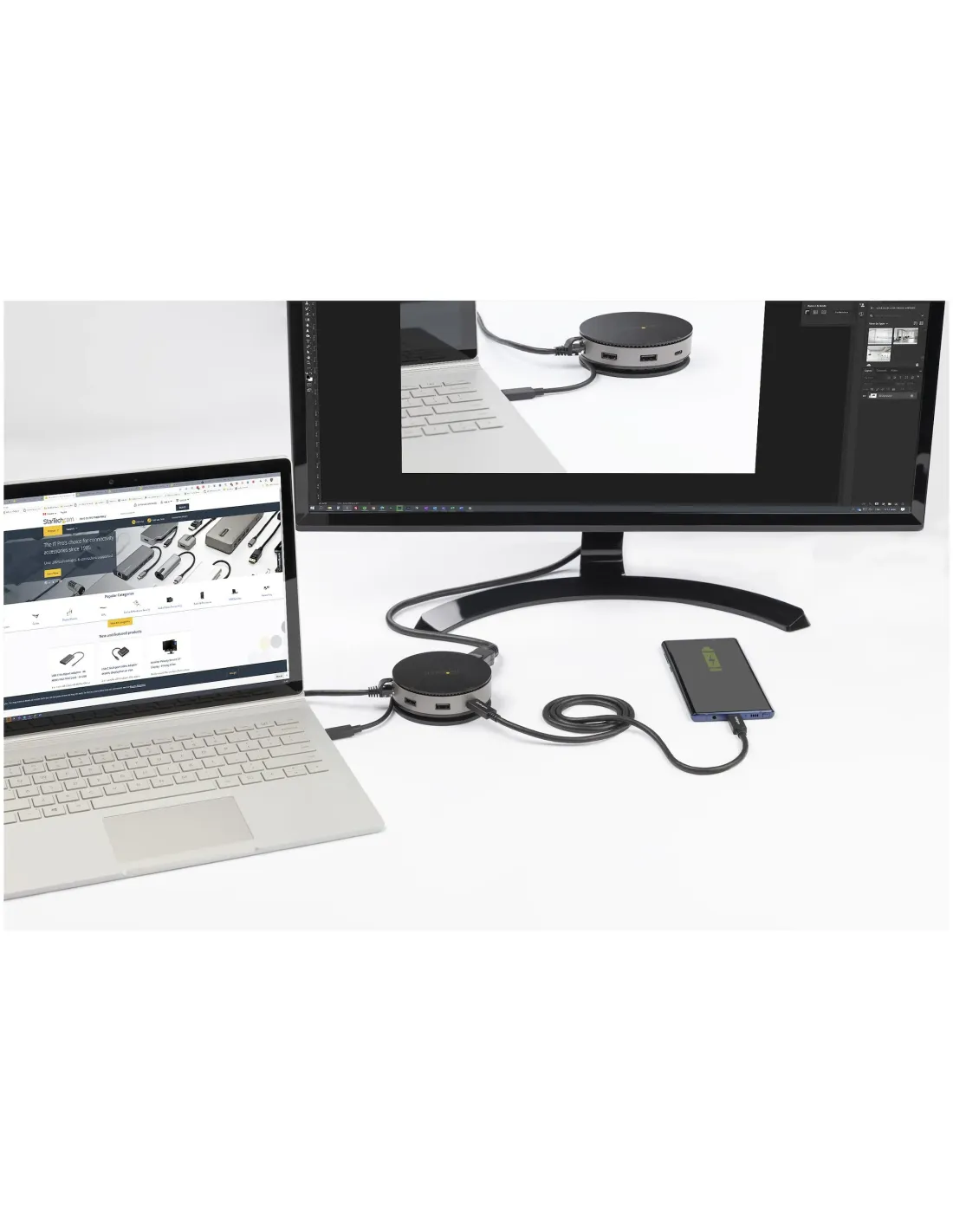MINI DOCKING STARTECH USB 3.1 GEN 2 DE 10GBPS TIPO C CON VÍDEO HDMI O DISPLAYPORT DE 4K A 60HZ O VGA DE 1080PESPECIFICACIONES TÉCNICASPuertos e InterfacesTecnología de conectividad: AlámbricoInterfaz de host: USB 3.2 Gen 2 (3.1 Gen 2) Type-CNúmero de puertos HDMI: 1Cantidad de puertos tipo A USB 3.2 Gen 2 (3.1 Gen 2): 2Cantidad de puertos tipo C USB 3.2 Gen 2 (3.1 Gen 2): 1Dispone de Suministro de potencia USBEntrega de energía USB (USB Power Delivery) de hasta: 75 WCantidad de puertos VGA (D-Sub): 1Cantidad de DisplayPorts: 1ConexiónDispone de EthernetEthernet LAN (RJ-45) cantidad de puertos: 1Ethernet LAN, velocidad de transferencia de datos: 10,100,1000 Mbit/sEstándares de red: IEEE 802.3ab, IEEE 802.3i, IEEE 802.3uDesempeñoColor del producto: Negro, GrisVelocidad de transferencia de datos: 10 Gbit/sResolución (máxima digital): 3840 x 2160 PixelesSoftwareSistema operativo Windows soportado: Windows 10, Windows 10 Education, Windows 10 Education x64, Windows 10 Enterprise, Windows 10 Enterprise x64, Windows 10 Home, Windows10 Home x64, Windows 10 IOT Core, Windows 10 IoT Enterprise, Windows 10 Pro, Windows 10 Pro x64, Windows 10 x64, Windows 8.1, Windows 8.1 Enterprise, Windows 8.1 Enterprise x64,Windows 8.1 Pro, Windows 8.1 Pro x64, Windows 8.1 x64Sistema operativo MAC soportado: Mac OS X 10.12 Sierra, Mac OS X 10.13 High Sierra, Mac OS X 10.14 Mojave, Mac OS X 10.15 Catalina, Mac OS X 10.15.3 Catalina, Mac OS X 11.0 Big SurSistemas operativos móviles soportados: Android, iOSOtros sistemas operativos soportados: CromoCondiciones ambientalesIntervalo de temperatura operativa: 0 - 50 CIntervalo de temperatura de almacenaje: -20 - 70 CIntervalo de humedad relativa para funcionamiento: 0 - 95%SostenibilidadCertificados de sostenibilidad: CE, RoHSPeso y dimensionesAncho: 90 mmProfundidad: 90 mmAltura: 32,5 mmPeso: 201 gEmpaquetadoAncho del paquete: 133 mmProfundidad del paquete: 145 mmAltura del paquete: 37 mmPeso del paquete: 278 gContenido del embalajeDispone de Guía de configuración rápidaDetalles técnicosCódigo de Sistema de Armomización (SA): 84733020Datos logísticosCantidad por caja: 48 pieza(s)Ancho de la caja principal: 300 mmLongitud de la caja: 555 mmAlto de la caja principal: 255 mm