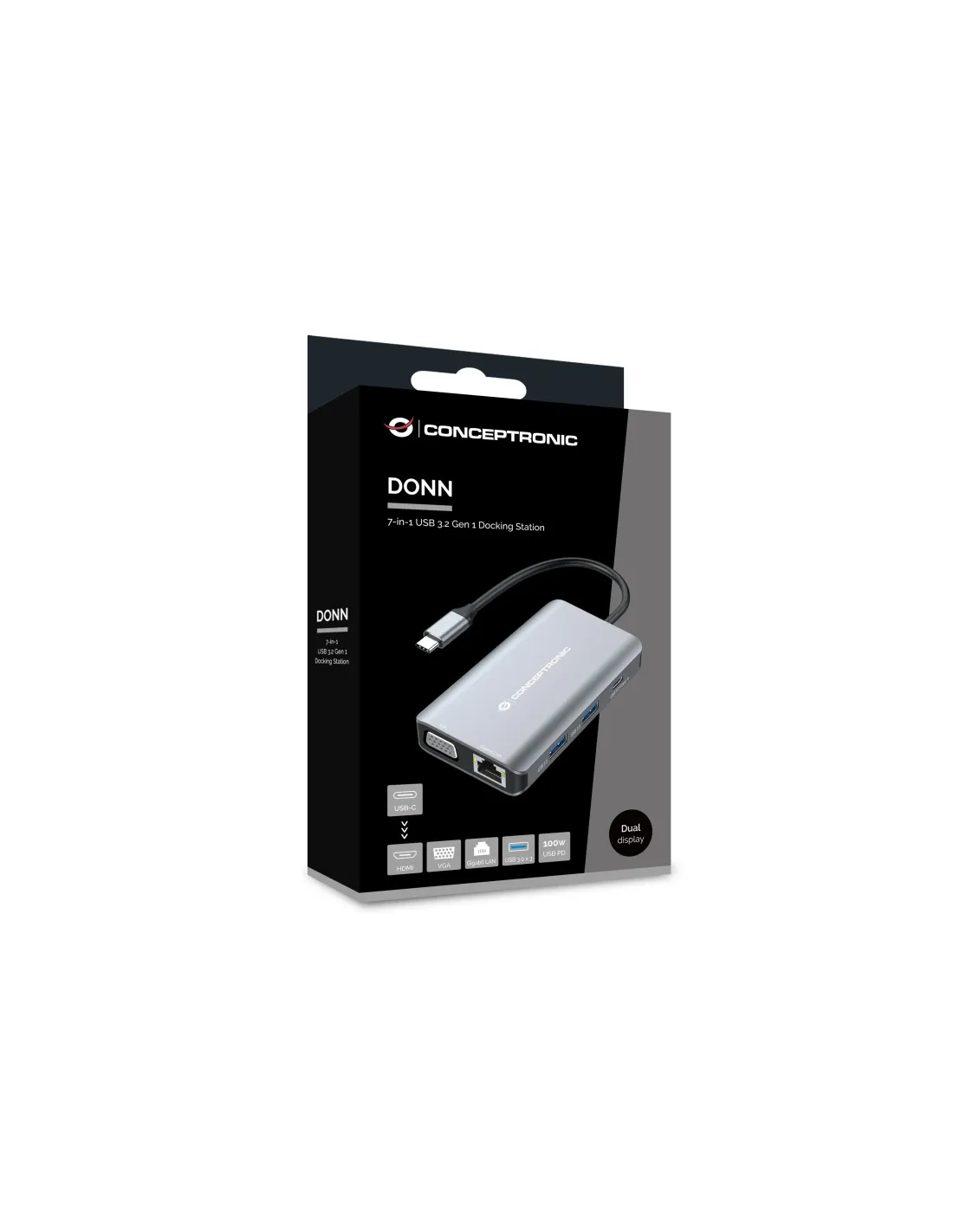 DONN21G Estación de acoplamiento 7 en 1 USB 3.2 Gen 1, HDMI, VGA, LAN GbE, USB-A 3.0 x 3, USB PD de 100 WNúmero de modelo DONN21GCódigo 110519407101Adaptador multipuerto 7 en 1 USB-C a HDMI/VGA/USB-C PD/USB 3.0/GbESoporta resolución HDMI hasta 4K 30HzSoporta resolución VGA hasta 1080P 60HzAdmite VGA y HDMI simultáneamenteAdmite suministro de energía USB (PD) de hasta 100 WProporciona un puerto Gigabit Ethernet con velocidades de hasta 1000MbpsFunción Wake-on-LAN incorporada para iniciar computadoras de forma remotaSupervelocidad USB 3.2 Gen 1 (5 Gb/s)Soporte multiplataforma: Windows, Mac OS, Chrome OSInstalación sencilla de conectar y usarOtroSistemas operativos compatibles Windows XP/Vista/7/8/10/11MacOS 10.5 o superiorAndroid 5.0 o superiorPor defectoColor GrisEAN 4015867231272Número de modelo DONN21GContenido del paquete DONN21GGuía de instalación rápida multilingeAkeneoInterfaz de host USB tipo C machoConfiguración de puertos HDMI x 1, VGA x 1, USB 3.0 x 3, Gigabit LAN x 1, USB-C PD x 1Longitud del cable 20 cmPeso del producto (kg) 0,076USB versión 3.0 (3.1/3.2 Gen 1)Resolución Pantalla dual: 1080PDimensiones (An. x Pr. x Al.) 55,5 x 90 x 17 mmHDMI versión 1.4