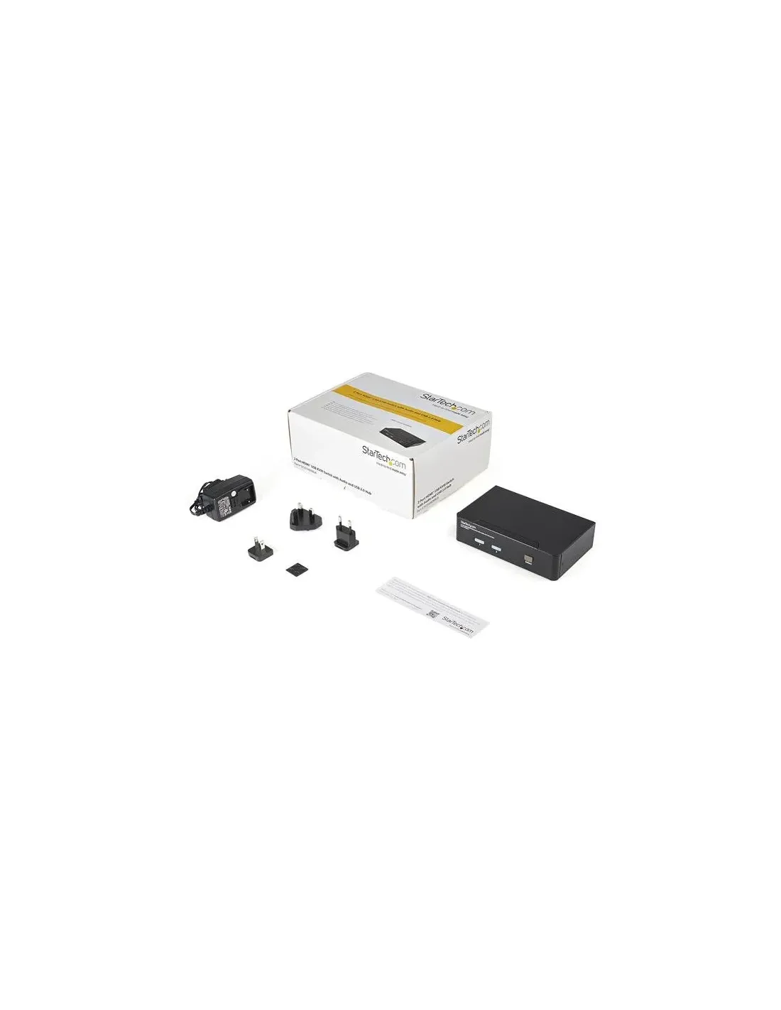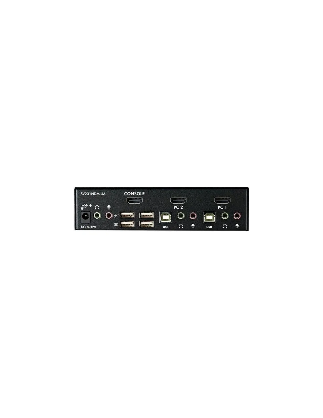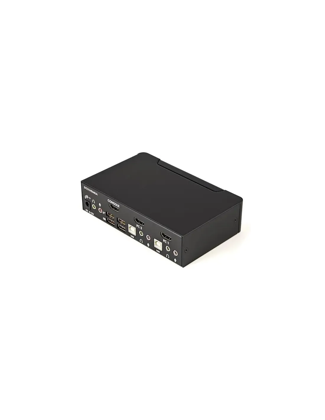 Características del StarTech.com Switch KVM 2 Puertos HDMI con Hub USB y AudioEl **conmutador KVM de 2 puertos de StarTech.com** está diseñado para usuarios que necesitan gestionar de forma eficiente **dos equipos desde un solo puesto de trabajo**, sin renunciar a la conectividad HDMI, el audio y periféricos USB. Ideal para entornos profesionales, oficinas técnicas o estaciones de trabajo domésticas avanzadas, este dispositivo permite alternar fácilmente entre ordenadores sin cambiar de monitor, teclado, ratón ni altavoces.Conmutación KVM completa con soporte HDMI y audioEste modelo ofrece una experiencia de control centralizada, compatible con **resoluciones de hasta 1920 x 1200**, ideal para tareas de ofimática, diseño o uso general. Además, incluye conexión para **audio y micrófono**, permitiendo mantener la funcionalidad multimedia entre sistemas conectados.Resolución máxima: 1920 x 12002 puertos HDMI, compatibles con vídeo en alta definiciónConectores para audio y micrófono mediante mini-jackHub USB 2.0 integrado para periféricosIncluye un **concentrador USB 2.0 de 2 puertos**, que permite compartir dispositivos como impresoras, memorias USB o webcams entre los dos equipos conectados. Esto elimina la necesidad de duplicar periféricos y simplifica el entorno de trabajo.4 puertos USB A: 2 dedicados para teclado y ratón, y 2 para periféricosInterfaz USB tipo B para conexión a los ordenadoresCambio rápido entre equipos mediante botones o softwareDiseño compacto y alimentación externaGracias a su diseño de sobremesa, este conmutador ocupa poco espacio y puede integrarse fácilmente en cualquier escritorio. La **alimentación externa** garantiza un rendimiento estable, incluso cuando se conectan varios dispositivos USB.Dimensiones: 12,5 x 7 x 4 cmPeso: 0,8 kgColor: NegroCompatibilidad y garantíaEste conmutador es compatible con una amplia gama de dispositivos gracias a sus interfaces estándar. Incluye **controladores y utilidades**, y está respaldado por una **garantía limitada de 3 años** por parte del fabricante.Certificaciones: FCC, RoHSIncluye software de gestiónGarantía limitada de 3 añosOtras especificacionesCantidad de usuarios locales: 1Tipo de dispositivo: Conmutador KVM / audio / USB - 2 puertosIndicadores LED de estado por puertoDispositivo de alimentación: Transformador eléctrico externo (CA 120/230 V)Diseñado para P/N: IM12D1500P, SVA12M2NEUA, SVA12M5NA
