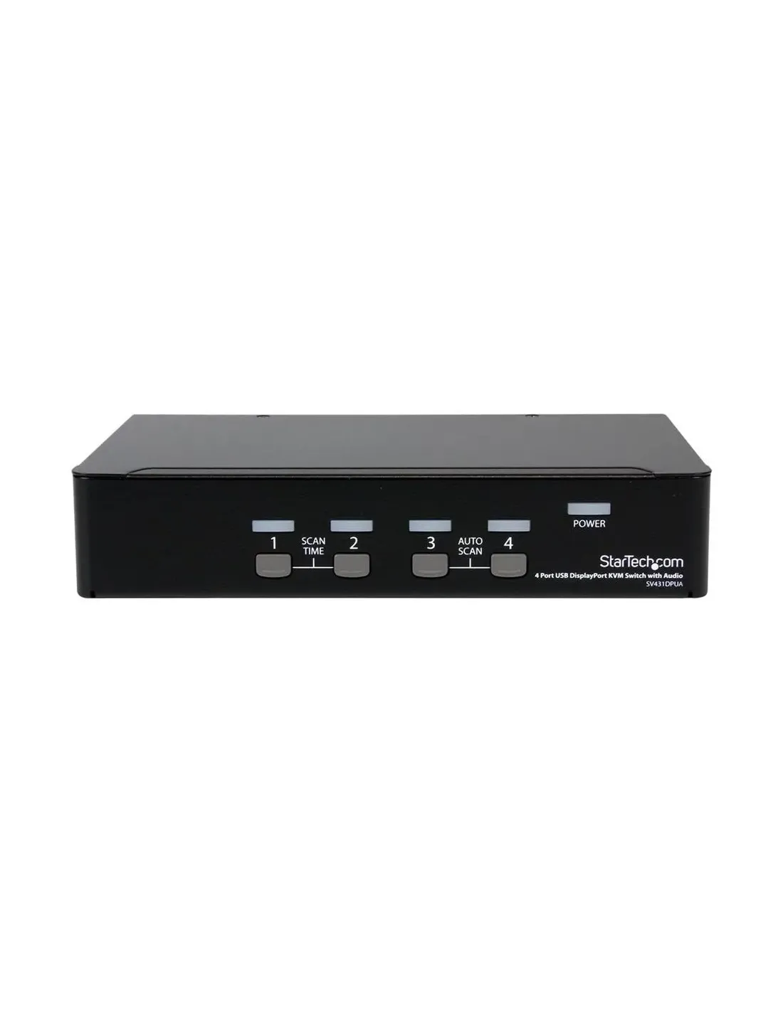 Características del StarTech.com Conmutador KVM 4 Puertos DisplayPort + Audio + USBEl **conmutador KVM de 4 puertos de StarTech.com** es una solución profesional para gestionar varios ordenadores desde una sola estación de trabajo, con soporte para vídeo DisplayPort de alta resolución, conexión USB 2.0 para periféricos y transmisión de audio bidireccional. Diseñado para entornos de oficina técnica, centros de control o estaciones de trabajo compartidas, este dispositivo ofrece **una experiencia de conmutación fluida, rápida y sin interrupciones**.Gestione 4 equipos desde una sola consolaGracias a su diseño con 4 puertos KVM, permite **controlar hasta cuatro ordenadores** desde un mismo monitor, teclado, ratón y set de audio, ahorrando espacio y optimizando recursos. La selección de dispositivos se puede realizar de forma intuitiva mediante botones en el frontal o atajos de teclado.4 puertos DisplayPort para vídeo de alta definiciónConexión de teclado y ratón vía USBAudio bidireccional: entrada de micrófono y salida de altavocesCalidad de imagen profesional hasta 2560 x 1600El conmutador soporta resoluciones de hasta **2560 x 1600 píxeles a 60 Hz**, ideal para aplicaciones que requieren precisión visual, como diseño gráfico, edición de vídeo o análisis de datos. Además, es compatible con tecnologías como DDC-2B y Plug and Play para facilitar la detección de monitores.Resolución máxima: 2560 x 1600 @ 60 HzCompatible con monitores DisplayPortConmutación sin interrupciones entre equiposHub USB 2.0 integrado para periféricosIncluye un **hub USB 2.0 de 2 puertos** para compartir dispositivos como impresoras, escáneres o unidades externas entre los equipos conectados, sin necesidad de reconexión manual. Esto mejora la eficiencia y reduce el cableado.2 puertos USB 2.0 de uso compartidoInterfaz rápida y compatible con Windows 7 y VistaAlimentación mediante adaptador externo incluidoDiseño compacto y preparado para montajeSu formato de sobremesa con carcasa resistente en color negro permite instalarlo fácilmente en cualquier espacio de trabajo. Opcionalmente, se puede montar en bastidor con kits compatibles para una organización profesional del entorno.Dimensiones: 22,1 x 13,1 x 4,4 cmPeso: 1,1 kgCompatible con kit de montaje en rack (opcional)Fiabilidad respaldada por garantía StarTech.comDiseñado para cumplir con estándares como **FCC, RoHS y Plug and Play**, este switch KVM cuenta con **garantía limitada de 3 años**, ofreciendo tranquilidad y soporte a largo plazo en entornos exigentes.Certificaciones: FCC, RoHS, Plug and PlayTemperatura de uso: de 0 °C a 40 °CHumedad operativa: 0% - 80%Otras especificacionesInterfaces adicionales: 4 x USB Type B, 4 x entradas y salidas de audio mini-jack1 x DisplayPort adicional para salida a monitorIndicadores LED para estado de puerto y alimentaciónCompatible con accesorios P/N: DP4N1USB6, IM12D1500P, SV431RACK, SVA12M2NEUA, SVA12M5NA