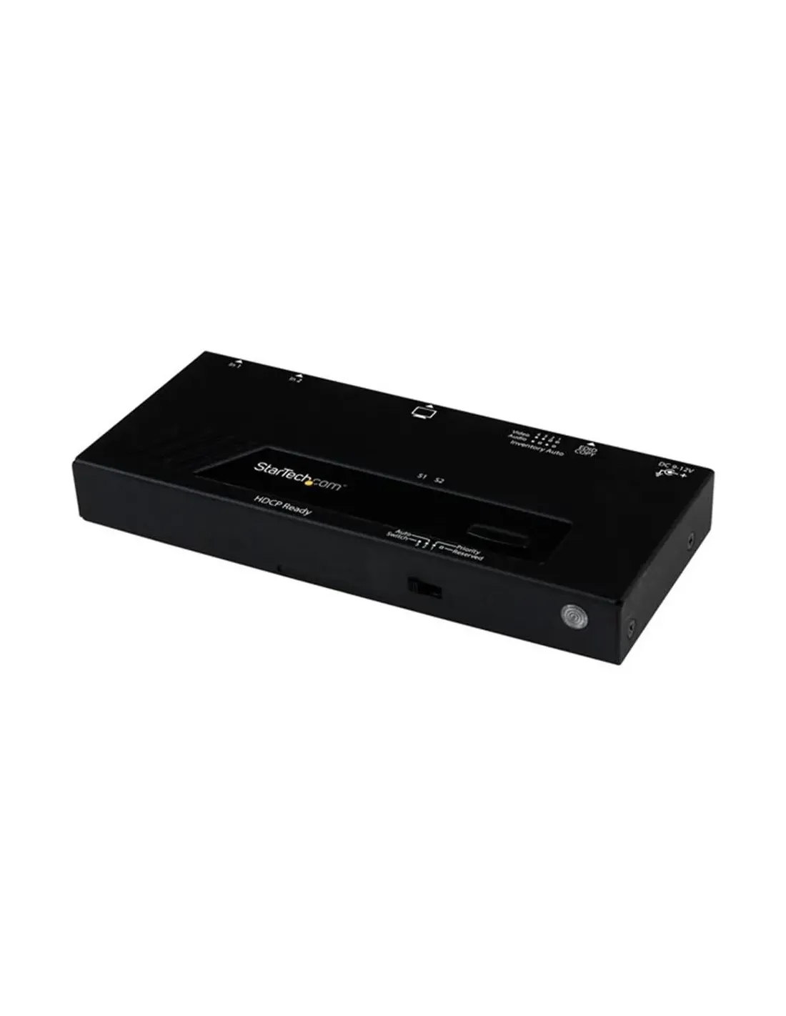 -GENERAL Indicadores de estado: Estado puerto Máxima resolución: 1920 x 1080 Tipo de caja: Sobremesa Subtipo: HDMI Tipo de dispositivo: Interruptor de vídeo/audio - 2 puertos Características: Compatible con HDCP -EXPANSIÓN / CONECTIVIDAD Interfaces: 2 x entrada HDMI 1 x salida HDMI -GARANTÍA DEL FABRICANTE Servicio y mantenimiento: Garantía limitada - 2 años -DIVERSO Kit de montaje en bastidor: Incluido Color: Negro Accesorios incluidos: Mando a distancia Localización: Reino Unido, Estados Unidos, Europa Cumplimiento de normas: FCC, RoHS -ALIMENTACIÓN Voltaje necesario: CA 120/230 V Dispositivo de alimentación: Transformador eléctrico externo -PARÁMETROS DE ENTORNO Temperatura mínima de funcionamiento: 0 °C Temperatura máxima de funcionamiento: 40 °C Temperatura mínima de almacenamiento: -20 °C Temperatura máxima de almacenamiento: 60 °C Ámbito de humedad de funcionamiento: 0 - 80 % -DIMENSIONES Y PESO Anchura: 15.6 cm Profundidad: 6.5 cm Altura: 2 cm Peso: 278 g -INFORMACIÓN SOBRE COMPATIBILIDAD Diseñado para: P/N: SVA12M2NEUA, SVA12M5NA