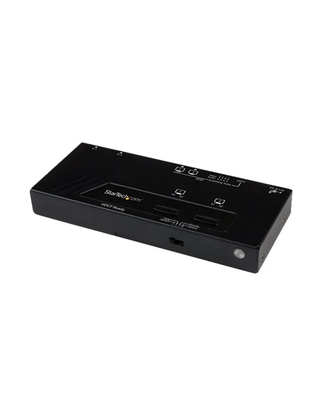 Características del StarTech.com Switch Matricial HDMI 2x2 con Conmutado AutomáticoEl **Switch HDMI 2x2 de StarTech.com** es una solución profesional para gestionar el enrutamiento de señales de vídeo y audio en configuraciones AV avanzadas. Diseñado para usuarios que necesitan **flexibilidad y control sobre múltiples fuentes y pantallas HDMI**, este conmutador matricial permite alternar automáticamente entre entradas o establecer prioridades, facilitando su integración en entornos corporativos, educativos o de entretenimiento.Conmutación inteligente y control remotoGracias a sus funciones de **conmutado automático y prioritario**, este switch detecta y selecciona de forma dinámica la entrada activa, garantizando una transición fluida entre dispositivos. Además, incluye un **mando a distancia** para mayor comodidad de uso en instalaciones de acceso limitado o uso frecuente.2 entradas HDMI y 2 salidas HDMI independientesSoporte para conmutación automática o manualMando a distancia infrarrojo incluidoResolución 4K y compatibilidad universalEste conmutador es compatible con **HDMI 1.4 y HDCP**, soportando una resolución máxima de **3840 x 2160 píxeles (4K UHD)**, ideal para presentaciones, señalización digital o salas multimedia. Su diseño garantiza una transmisión fiable y sin interrupciones, incluso en sistemas complejos.Resolución máxima: 3840 x 2160 (Ultra HD)Compatible con HDCPDiseñado para uso en Reino Unido, Estados Unidos y EuropaDiseño compacto y montaje versátilEl dispositivo presenta un formato **de sobremesa compacto**, con posibilidad de **montaje en bastidor**, ideal para racks profesionales. Fabricado en color negro y con un peso de solo 278 g, se integra fácilmente en cualquier entorno sin ocupar espacio excesivo.Dimensiones: 15,6 cm (ancho) x 6,5 cm (profundidad) x 2 cm (alto)Peso: 278 gIncluye kit de montaje en bastidorResistencia y fiabilidad garantizadasPreparado para operar en condiciones exigentes, soporta un rango térmico desde 0 °C hasta 40 °C en funcionamiento, y hasta 60 °C en almacenamiento. Su fuente de alimentación externa permite una instalación más flexible en distintos entornos.Voltaje de entrada: CA 120/230 VTransformador eléctrico externo incluidoCertificaciones: FCC, RoHSOtras especificacionesTipo de dispositivo: Interruptor de vídeo/audio - 2 puertosSubtipo: HDMIIndicadores LED de estado por puertoÁmbito de humedad de funcionamiento: 0 - 80%Temperatura de almacenamiento: de -20 °C a 60 °CCompatibilidad: Diseñado para P/N: SVA12M2NEUA, SVA12M5NA