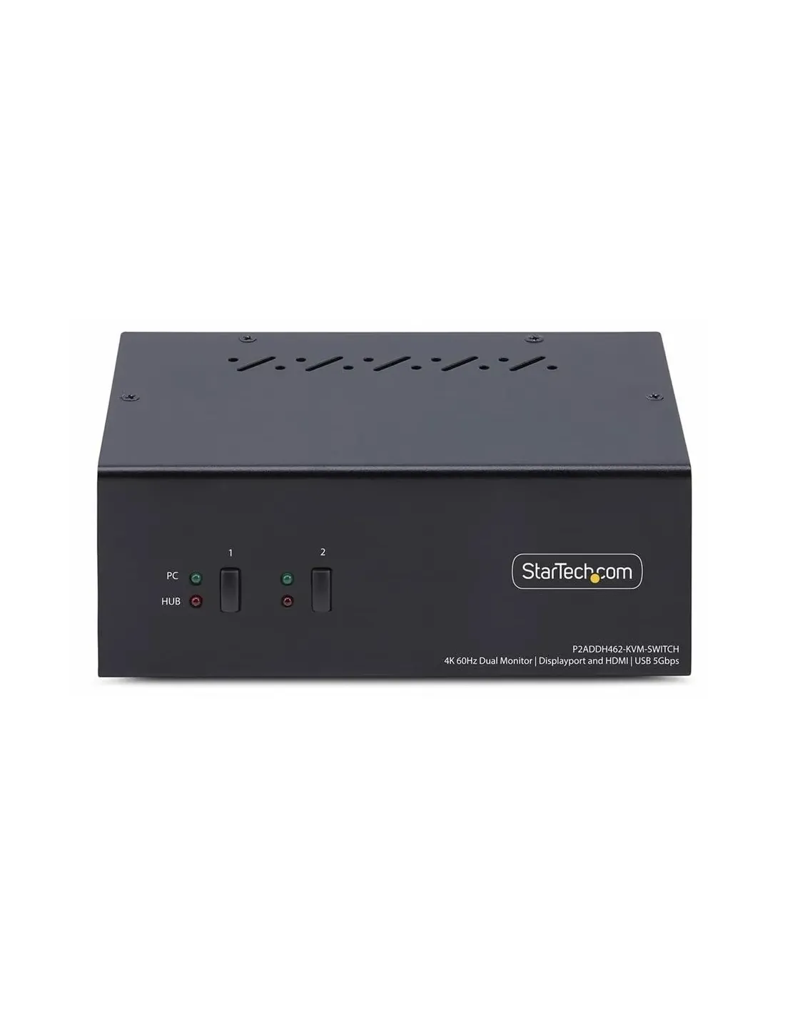Características del StarTech.com 2-Port Dual-Monitor DisplayPort en HDMI KVM Switch 4K 60HzEl conmutador KVM StarTech.com de 2 puertos con doble monitor está diseñado para usuarios que necesitan controlar dos equipos desde un único puesto de trabajo, manteniendo una experiencia visual de alta calidad. Compatible con resoluciones 4K a 60 Hz y con soporte para audio multicanal, es una solución ideal para entornos profesionales, técnicos o de productividad avanzada donde la eficiencia y la conectividad son clave.Control dual con soporte para doble monitor 4KEste KVM permite gestionar dos ordenadores utilizando una sola consola con salidas DisplayPort y HDMI, ofreciendo una experiencia visual fluida y nítida en configuraciones de doble pantalla. Su compatibilidad con resoluciones Ultra HD 4K garantiza una visualización detallada, ideal para diseño, edición o tareas multitarea exigentes.Resolución máxima: 3840 x 2160 a 60 HzSalida de consola: DisplayPort + HDMISoporte para configuración de doble monitorConectividad completa y compatibilidad USB avanzadaIntegra múltiples puertos USB para conectar periféricos y dispositivos adicionales, incluyendo compatibilidad con USB 2.0, USB 3.0 y USB 3.2 Gen 1. Esto permite una transferencia de datos eficiente y la conexión de teclado, ratón y otros dispositivos sin limitaciones.2 puertos USB 2.0 Type A y 2 puertos USB 3.0 Type A en consola2 entradas USB 3.0 Type B para equiposInterfaz de teclado y ratón USBAudio integrado y experiencia multimedia completaEl dispositivo incluye soporte para audio de 7.1 canales, permitiendo gestionar tanto entrada de micrófono como salida de auriculares desde la misma consola. Esto lo convierte en una opción adecuada para estaciones de trabajo multimedia o comunicaciones.Entrada y salida de audio mediante mini-jackCompatible con audio multicanal 7.1Gestión de audio independiente por equipoDiseño robusto y funciones avanzadas de controlConstruido con carcasa metálica resistente, este KVM está preparado para un uso intensivo. Incorpora funcionalidades como conmutación mediante botón o teclas rápidas (hotkeys), indicadores LED y protección avanzada contra interferencias y descargas electrostáticas.Carcasa metálica con protección EMIProtección ESD: 8 KV (aire) / 6 KV (contacto)Control mediante botón físico y hotkeysIndicadores LED de estado y zumbador integradoFiabilidad, compatibilidad y eficiencia energéticaCon un diseño orientado a la estabilidad, este dispositivo ofrece una alta fiabilidad con un MTBF de 138.390 horas. Además, cumple con normativas internacionales y es compatible con TAA, lo que lo hace apto para entornos corporativos y gubernamentales.Compatible con TAACertificaciones: RoHS y WEEEConsumo eléctrico: 36 WAlimentación: adaptador externo 12 V / 3 ADiseño compacto y preparado para cualquier entornoSu formato de sobremesa compacto facilita su integración en cualquier espacio de trabajo, manteniendo un equilibrio entre funcionalidad y tamaño. Incluye accesorios como enchufes internacionales para mayor versatilidad.Dimensiones: 16,3 x 10 x 6,6 cmPeso: 750 gColor: negroIncluye enchufes internacionalesOtras especificaciones1 usuario local soportado2 puertos KVM / audio / USBTemperatura de funcionamiento: 0 °C a 40 °CHumedad de funcionamiento: 0 - 90% RH sin condensaciónTemperatura de almacenamiento: -20 °C a 60 °C