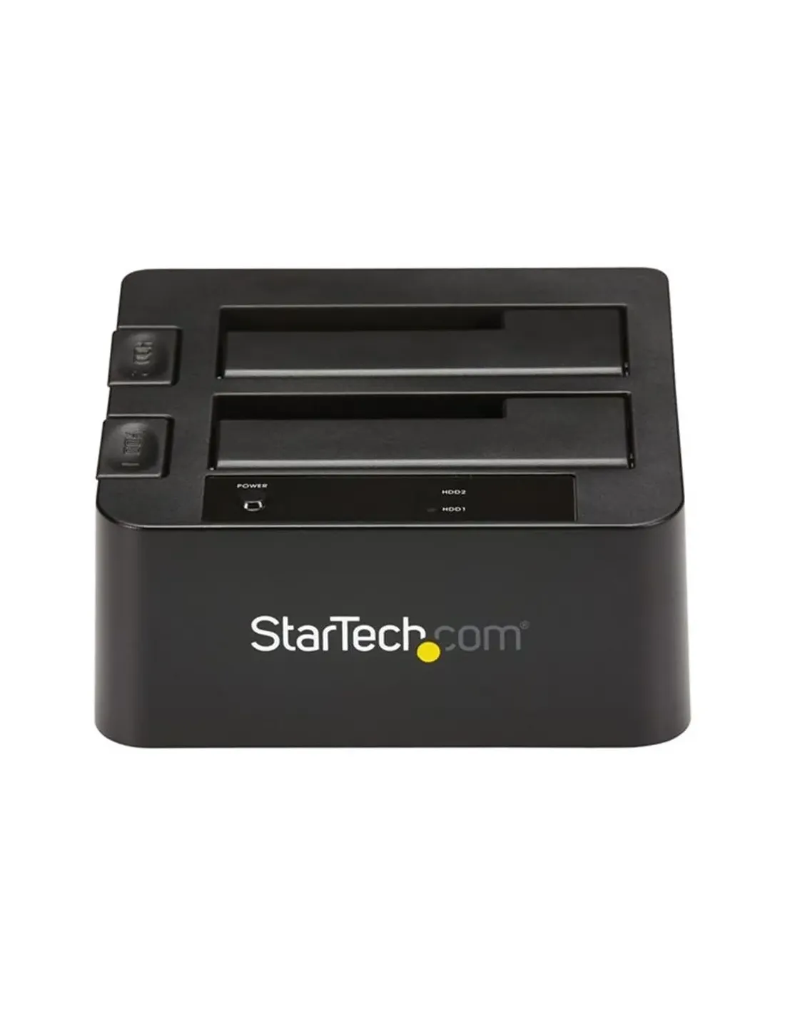 Características de la StarTech.com Dual-Bay USB 3.1 Docking Station para discos duros SATALa estación de acoplamiento StarTech.com Dual-Bay USB 3.1 es una solución práctica y versátil para gestionar discos duros y SSD de forma externa. Diseñada para usuarios que necesitan acceso rápido, clonación o transferencia de datos, permite trabajar con unidades de 2,5" y 3,5" sin necesidad de instalación interna. Su conectividad USB 3.1 Gen 2 de alta velocidad y su diseño de carga superior facilitan un uso cómodo y eficiente tanto en entornos profesionales como domésticos.Alta velocidad de transferencia con USB 3.1 Gen 2Gracias a su interfaz USB 3.1 (Gen 2) de hasta 10 Gbps, esta docking station garantiza transferencias rápidas y estables, ideales para mover grandes volúmenes de datos. Además, incorpora soporte para protocolo UASP, lo que mejora significativamente el rendimiento frente a interfaces tradicionales.Interfaz USB 3.1 Gen 2 (hasta 10 Gbps)Compatibilidad con protocolo UASPConexión mediante puerto Micro-USB tipo B de 10 pinesCompatibilidad total con HDD y SSDEsta base es compatible con discos duros y unidades SSD SATA en formatos de 2,5" y 3,5", ofreciendo una solución flexible para diferentes necesidades de almacenamiento. Soporta unidades de gran capacidad y alto rendimiento, lo que la hace adecuada para copias de seguridad, recuperación de datos o ampliación de almacenamiento.Compatible con discos de 2,5" y 3,5"Interfaz SATA III (6 Gb/s)Soporte probado con discos de hasta 6 TB y 7200 RPMDoble bahía con función Hot-SwapSu diseño de doble bahía permite utilizar dos unidades simultáneamente, facilitando la gestión de datos o copias entre discos. La función hot-swap permite insertar o retirar discos sin apagar el equipo, optimizando el flujo de trabajo.2 bahías hot-swap compartidasCompatible con HDD y SSD simultáneamenteDiseño de carga superior (top-loading)Diseño funcional y seguroFabricada en plástico resistente y con un acabado en color negro, esta docking station ofrece un diseño compacto y estable. Incorpora indicadores LED de estado y actividad para un control visual sencillo durante el uso.Indicadores LED de encendido y actividadDiseño compacto y ligeroMaterial resistente para uso diarioConectividad y alimentación completasIncluye todos los accesorios necesarios para su funcionamiento, como cable USB y adaptadores de corriente. Su alimentación externa asegura un rendimiento estable incluso con discos de alto consumo.Incluye cable USB4 adaptadores de corriente incluidosAlimentación mediante adaptador (CA 120/230 V)Otras especificacionesProcesador: ASMedia ASM1352RCertificaciones: FCC, RoHSTemperatura de funcionamiento: 5 °C a 35 °CHumedad de funcionamiento: 20% - 80%Dimensiones: 14.8 x 13.2 x 7 cmPeso: 530 g