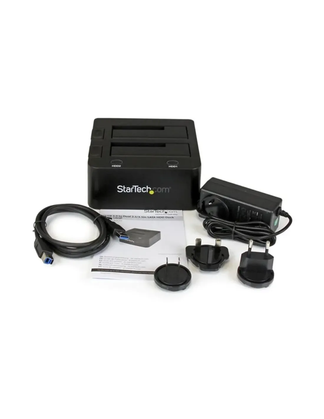 Características de la StarTech.com Dual-Bay USB 3.0 to SATA Hard Drive Docking StationLa base de conexión para discos duros StarTech.com Dual-Bay es una solución práctica y eficiente para gestionar, clonar o acceder a unidades de almacenamiento de forma rápida. Diseñada para usuarios que necesitan flexibilidad y acceso inmediato a discos SATA, permite trabajar con discos duros y SSD de 2.5" y 3.5" sin necesidad de instalación interna, gracias a su sistema de carga superior y función hot-swap.Compatibilidad dual para discos de 2.5" y 3.5"Esta docking station ofrece compatibilidad total con unidades SATA, permitiendo utilizar tanto discos duros tradicionales como SSD en distintos formatos. Su diseño de doble bahía facilita trabajar con dos unidades simultáneamente, optimizando tareas como transferencias o copias de seguridad.Compatible con discos de 2.5" y 3.5"Soporte para HDD y SSD SATA2 bahías hot-swap compartidasTransferencias rápidas mediante USB 3.0Gracias a la conexión USB 3.0, esta base permite alcanzar velocidades de transferencia de hasta 6 Gbit/s, aprovechando al máximo el rendimiento de las unidades SATA III. Ideal para mover grandes volúmenes de datos de forma rápida y estable.Interfaz USB 3.0 (conector Type B de 9 pines)Soporte SATA III de hasta 6 Gb/sChipset ASM1053E / VIA812Diseño práctico con carga superiorSu formato top-loading facilita la inserción y extracción de discos sin herramientas, permitiendo un uso cómodo tanto en entornos profesionales como domésticos. Además, la función hot-swap permite cambiar unidades sin necesidad de apagar el sistema.Diseño de carga superior sin herramientasIntercambio en caliente (hot-swap)Formato compacto y funcionalAmplia compatibilidad de sistemasEsta docking station es compatible con una gran variedad de sistemas operativos, lo que la convierte en una opción versátil para diferentes entornos de trabajo, desde equipos Windows hasta Mac, Linux o Chrome OS.Compatible con Windows, MacOS y LinuxSoporte para Chrome OSAmplia compatibilidad con versiones anteriores de sistemasDiseño robusto y funcionamiento estableFabricada con materiales resistentes y con alimentación mediante adaptador externo, garantiza un funcionamiento estable incluso en uso intensivo. Además, ha sido probada con diferentes capacidades de disco para asegurar su fiabilidad.Color negro, diseño compactoAdaptador de corriente incluido (CA 120/230 V)Probada con discos de hasta 4 TB (3.5") y 2 TB (2.5")Otras especificacionesDimensiones: 14.8 x 13.2 x 7 cmPeso: 532 gTemperatura de funcionamiento: 5 °C - 35 °CHumedad de funcionamiento: 20 - 80%Cable USB 3.0 incluidoCertificaciones: FCC, RoHSGarantía: 2 años