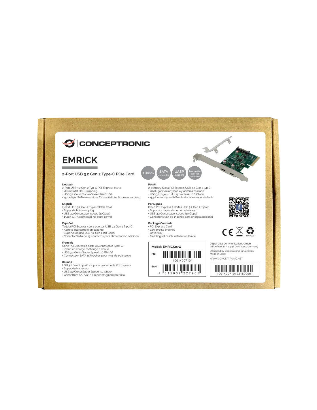 Conceptronic EMRICK07G. Interfaz de host: PCIe, Interfaz de salida: USB 3.2 Gen 2 (3.1 Gen 2), Estándar de la tarjeta de expansión: PCI 2.0. Color del producto: Verde, Utilizar con: PC, País de origen: China. Circuito integrado: ASM1142, Tasa de transferencia de datos (max): 10 Gbit/s. Sistema operativo Windows soportado: Windows 7 Ultimate x64, Windows 10, Windows 7 x64, Windows 10 Education, Windows 8, Windows 10.... Ancho: 58 mm, Profundidad: 80 mm, Altura: 20 mm