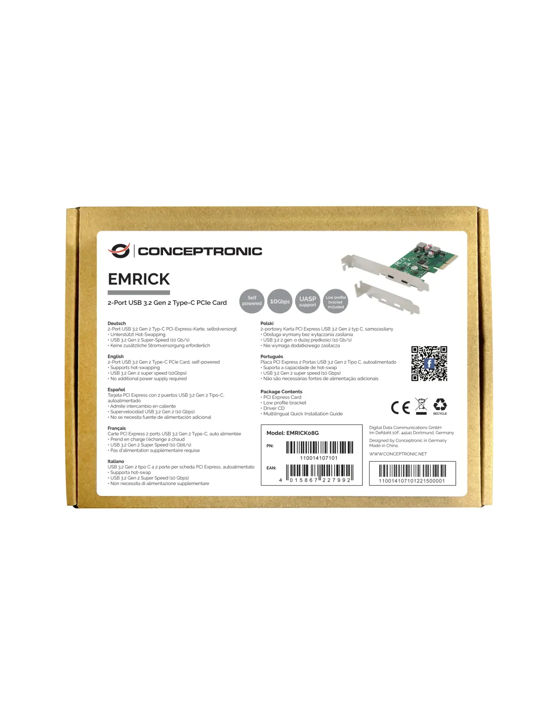 Conceptronic EMRICK08G, PCIe, USB 3.2 Gen 2 (3.1 Gen 2), PCI 3.0, Verde, PC, China
