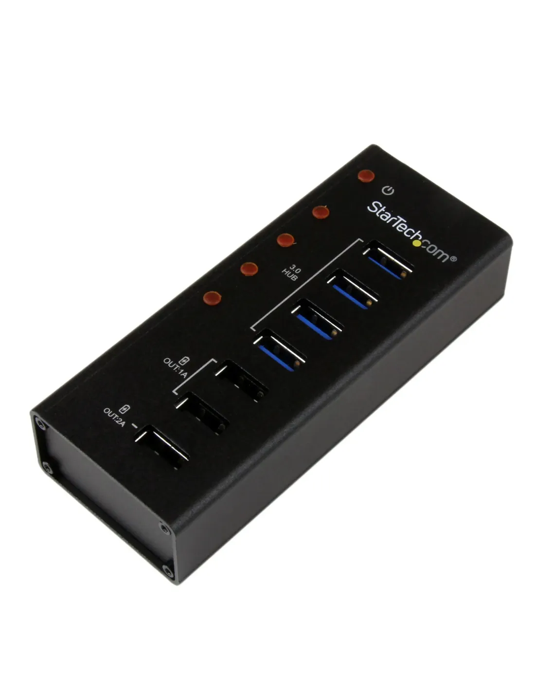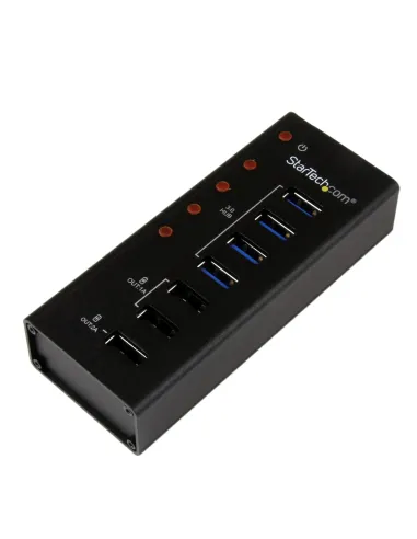StarTech.com Hub Concentrador USB 3.0 (5Gbps) de 4 Puertos y 3 Puertos de Carga USB ( 2x 1A y 1x 2A) - Ladrón con Carcasa de Metal. Interfaz de host: USB 3.2 Gen 1 (3.1 Gen 1) Type-B, Interfaces de concentradores: USB 2.0, USB 3.2 Gen 1 (3.1 Gen 1) Type-A. Velocidad de transferencia de datos: 5000 Mbit/s, Color del producto: Negro, Material de la carcasa: Aluminio. Tipo de fuente de alimentación: CC, Voltaje de entrada: 100 - 240 V, Corriente de entrada: 1.3 A. Sistema operativo MAC soportado: Mac OS X 10.5 Leopard, Mac OS X 10.6 Snow Leopard, Mac OS X 10.7 Lion, Mac OS X 10.8 Mountain.... Ancho: 45 mm, Profundidad: 110 mm, Altura: 24 mm
