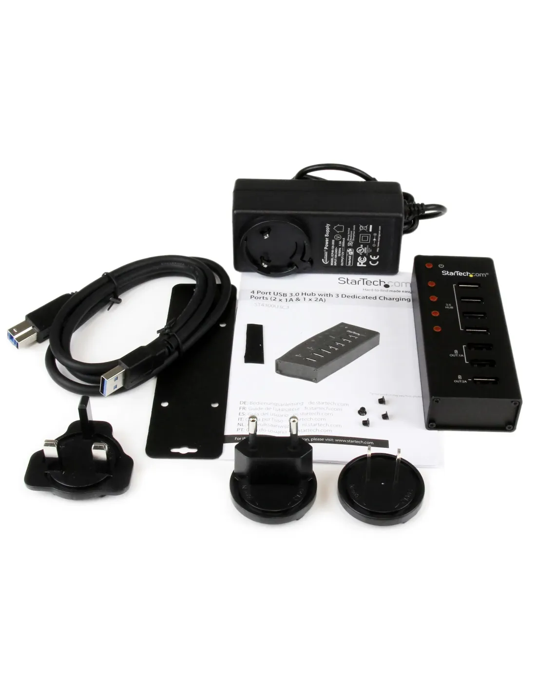 El concentrador USB 3.2 Gen 1, modelo ST4300U3C3, permite la funcionalidad simultánea de concentrador de datos y cargador USB, ya que permite agregar tres puertos USB dedicados, así como cuatro puertos USB de datos, que hacen un total de siete puertos, todos conectados a través de una sola conexión USB 3.2 Gen 1 anfitrión. Los puertos del concentrador USB cumplen con la especificación técnica para SuperSpeed USB 3.2 Gen 1, que permite velocidades de transferencia de datos de hasta 5Gbps, además de retrocompatibilidad con los dispositivos USB 2.0 y 1.x. Este concentrador USB con alimentación externa también integra 3 puertos USB de carga dedicados, 2 x 1A y 1 x 2A, lo cual permite la funcionalidad de concentrador de datos y estación de carga USB. La compatibilidad con la especificación USB para carga de baterías versión 1.2 permite la carga de la mayoría de dispositivos móviles, incluidos iPhone® y iPad® de Apple®, Surface™ de Microsoft®, Samsung Galaxy Tab™ y muchos más. Diseñado para fácil acceso a los puertos cuando se conectan o desconectan dispositivos, el concentrador incluye orientación vertical de los puertos, así como una duradera y compacta caja de metal. Para más flexibilidad, incluye un soporte para instalación en pared.