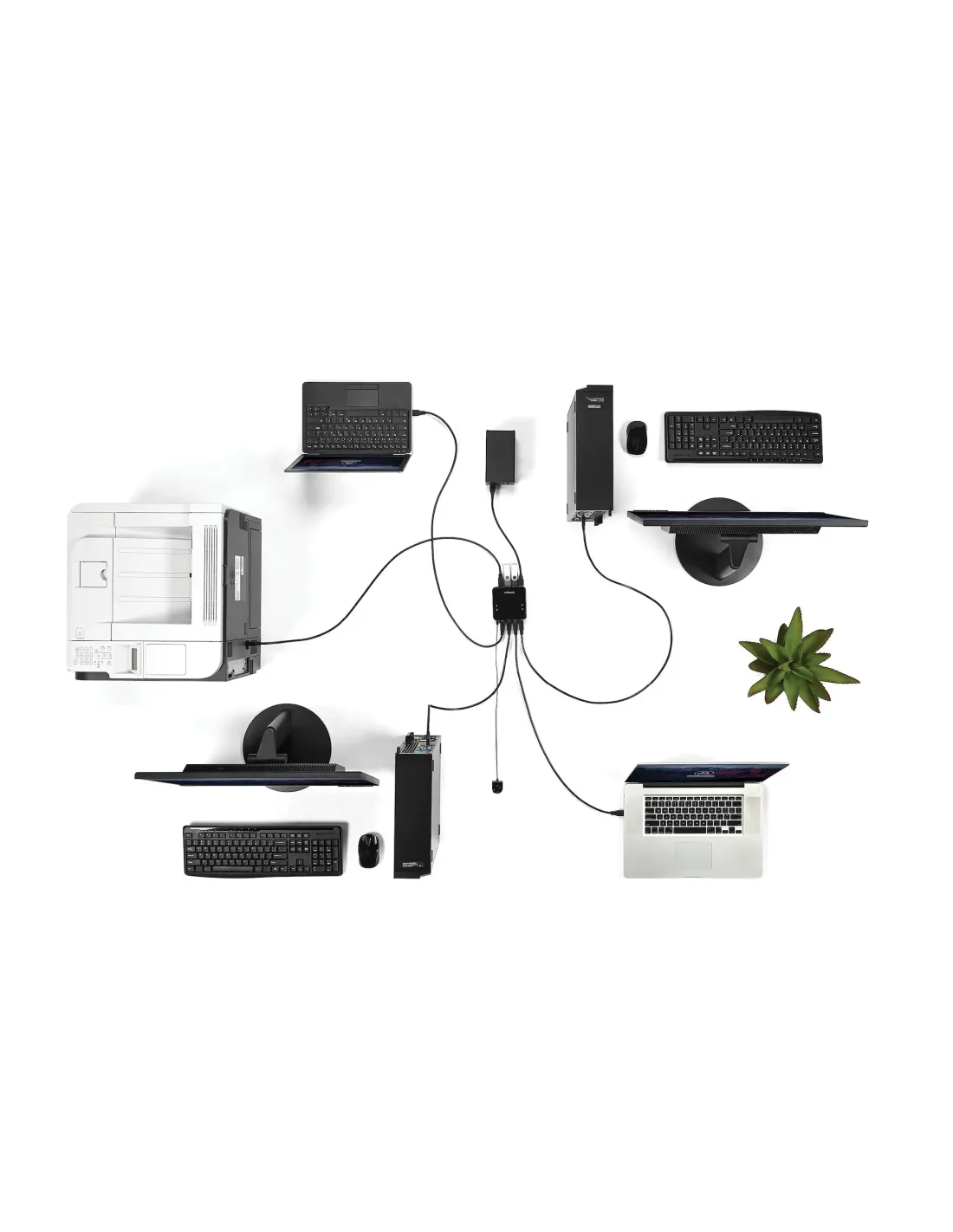 Evite los gastos de adquirir periféricos duplicados mediante el uso compartido de dispositivos (como impresoras, unidades portátiles de disco duro, ratón y teclado USB), con hasta cuatro ordenadores. Este conmutador USB también evita tener que cambiar de cable entre un sistema y otro, lo cual le ahorra tiempo y esfuerzo.