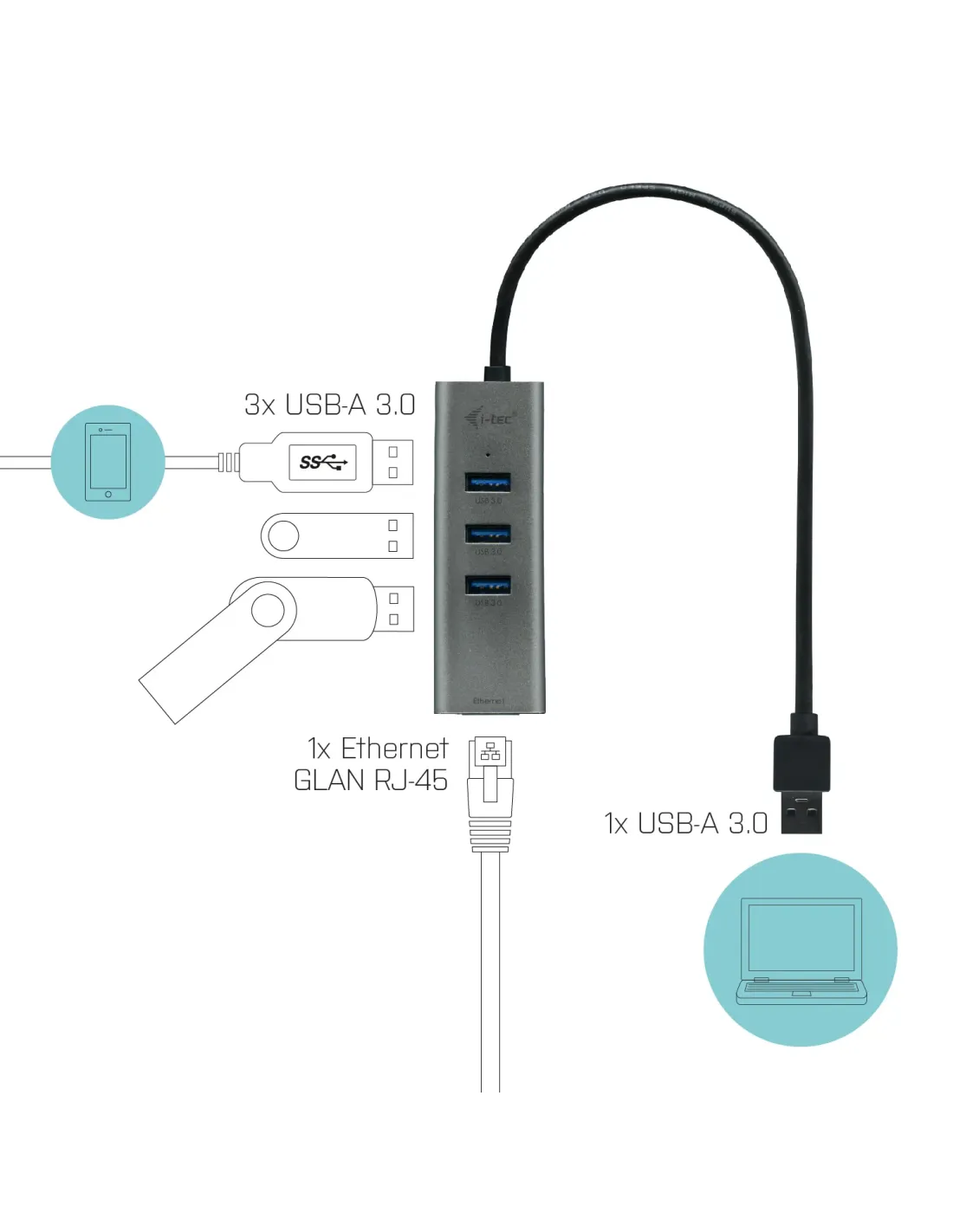 i-tec Metal USB 3.0 HUB 3 Port + Gigabit Ethernet Adapter, USB 3.2 Gen 1 (3.1 Gen 1) Type-A, RJ-45, USB 3.2 Gen 1 (3.1 Gen 1) Type-A, 5000 Mbit/s, Gris, Metal, Enlace