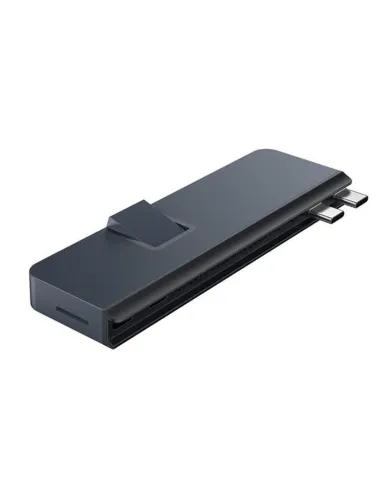 El HyperDrive DUO PRO no solo destaca por su rendimiento, sino también por su **diseño ultracompacto y estético**, ideal para llevar junto al portátil sin ocupar espacio adicional. Su estructura en color azul metálico le aporta un toque moderno y profesional.