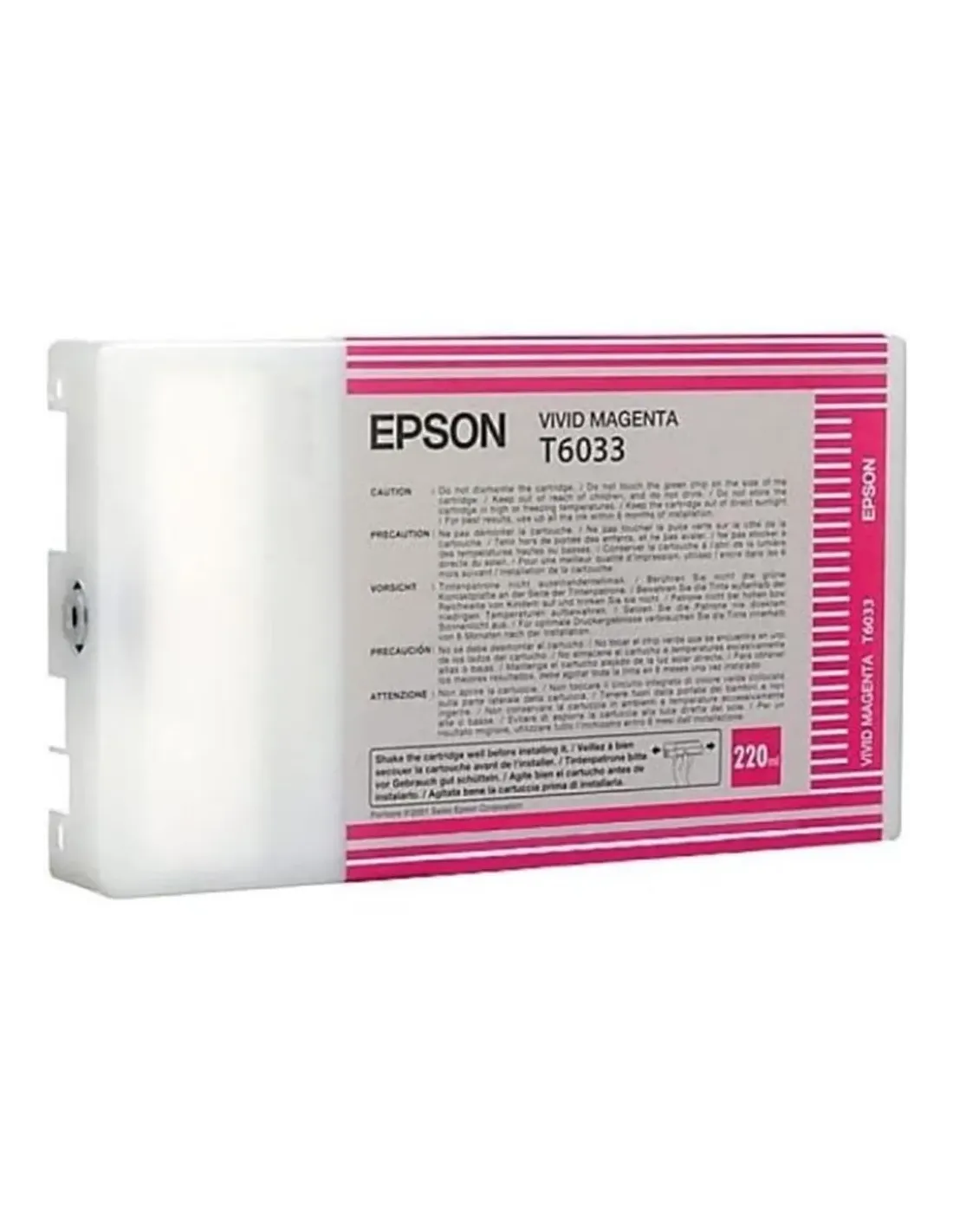 CaracterísticasTipo OriginalCódigo OEM C13T603300Tipo de tinta Pigment-based inkVolumen de tinta de color 220 mlCantidad de cartuchos de tinta de color 1Tipo de tinta de color Pigment-based inkDatos logísticosCantidad por palé 420 pieza(s)Alto de la caja principal 130 mmAncho de la caja principal 390 mmAnchura del palé 800 mmLongitud del palé 1200 mmAltura del palé 910 mmLongitud de la caja 470 mmCantidad por caja 30 pieza(s)Cantidad por capa de palet 120 pieza(s)Cantidad por capa de palé (Reino Unido) 180 pieza(s)Cantidad por palé (Reino Unido) 840 pieza(s)Longitud del palé (Reino Unido) 1200 mmAnchura del palé (Reino Unido) 1000 mmAltura del palé (Reino Unido) 910 mmDesempeñoTecnología de impresión Inkjet printingCompatibilidad Stylus Pro 7880/9880Colores de impresión Vivid magentaPaís de origen ChinaMarca compatible EpsonDetalles técnicosCódigo de Sistema de Armomización (SA) 84439990EmpaquetadoPeso del paquete 0.403 gProfundidad del paquete 190 mmAltura del paquete 110 mmAncho del paquete 30 mmCantidad por paquete 1 pieza(s)
