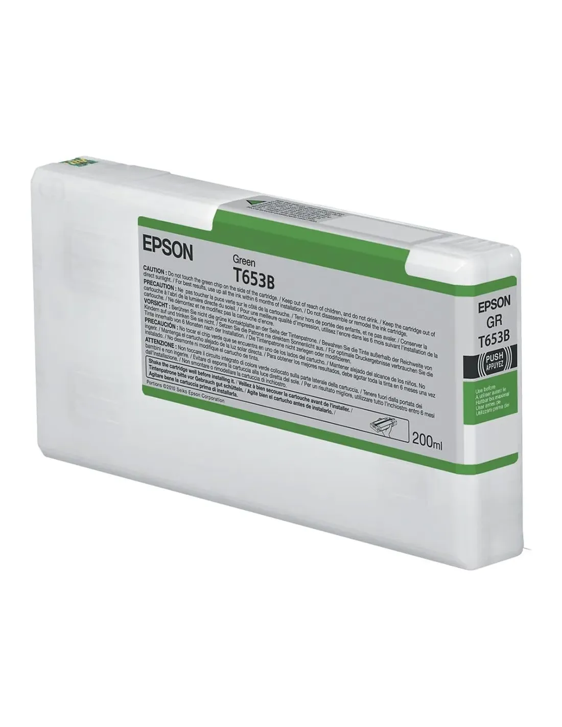 CaracterísticasTipo OriginalCódigo OEM C13T653B00Tipo de tinta Pigment-based inkVolumen de tinta de color 200 mlCantidad de cartuchos de tinta de color 1Tipo de tinta de color Pigment-based inkDatos logísticosCantidad por palé 864 pieza(s)Anchura del palé 800 mmLongitud del palé 1200 mmAltura del palé 510 mmCantidad por capa de palet 72 pieza(s)Cantidad por palé (Reino Unido) 1296 pieza(s)DesempeñoTecnología de impresión Inkjet printingCompatibilidad Stylus Pro 4900Colores de impresión GreenPaís de origen ChinaMarca compatible EpsonDetalles técnicosCódigo de Sistema de Armomización (SA) 84439990EmpaquetadoPeso del paquete 0.392 gProfundidad del paquete 215 mmAltura del paquete 115 mmAncho del paquete 40 mmCantidad por paquete 1 pieza(s)