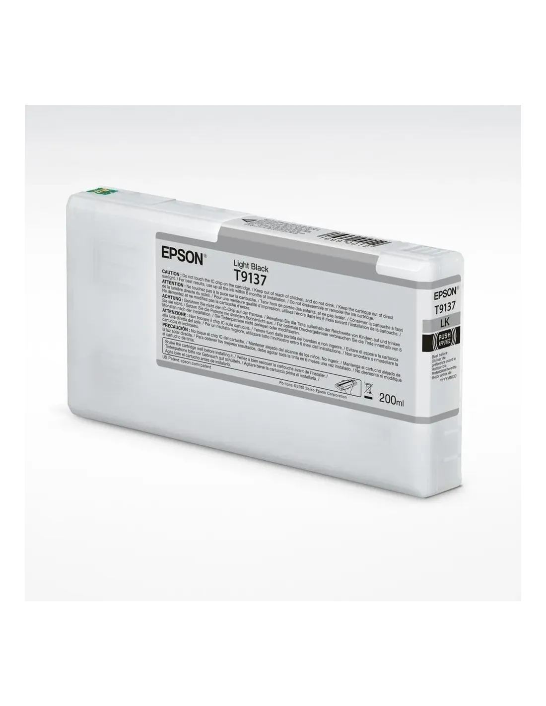 CaracterísticasTipo OriginalTipo de cartucho de tinta Standard YieldCódigo OEM C13T913700Tipo de tinta Pigment-based inkVolumen de tinta negra 200 mlCantidad de cartuchos de tinta negra 1Tipo de tinta de color Pigment-based inkDatos logísticosCantidad por palé 864 pieza(s)Cantidad por caja 12 pieza(s)Cantidad por palé (Reino Unido) 1296 pieza(s)DesempeñoTecnología de impresión Inkjet printingColores de impresión Light blackPaís de origen IndonesiaMarca compatible EpsonDetalles técnicosCódigo de Sistema de Armomización (SA) 84439990EmpaquetadoPeso del paquete 0.4 gProfundidad del paquete 215 mmAltura del paquete 115 mmAncho del paquete 40 mmCantidad por paquete 1 pieza(s)