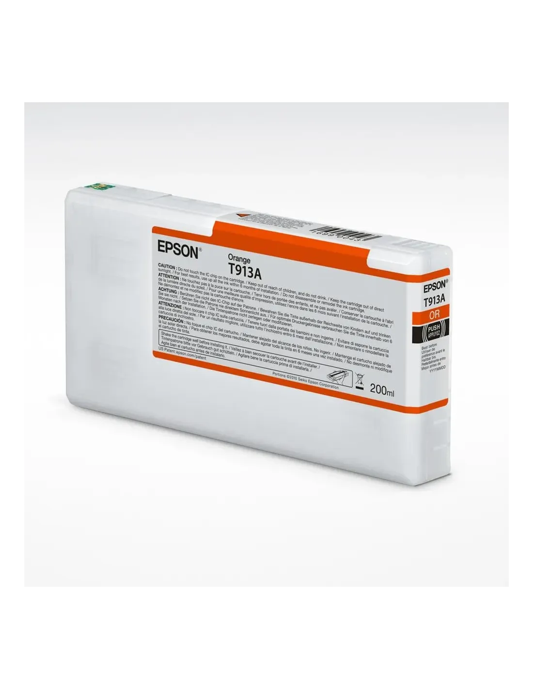 CaracterísticasTipo OriginalTipo de cartucho de tinta Standard YieldCódigo OEM C13T913A00Tipo de tinta Pigment-based inkVolumen de tinta de color 200 mlCantidad de cartuchos de tinta de color 1Tipo de tinta de color Pigment-based inkDatos logísticosCantidad por palé 864 pieza(s)Cantidad por caja 12 pieza(s)Cantidad por palé (Reino Unido) 1296 pieza(s)DesempeñoTecnología de impresión Inkjet printingColores de impresión OrangePaís de origen IndonesiaMarca compatible EpsonDetalles técnicosCódigo de Sistema de Armomización (SA) 84439990EmpaquetadoPeso del paquete 0.4 gProfundidad del paquete 215 mmAltura del paquete 115 mmAncho del paquete 40 mmCantidad por paquete 1 pieza(s)