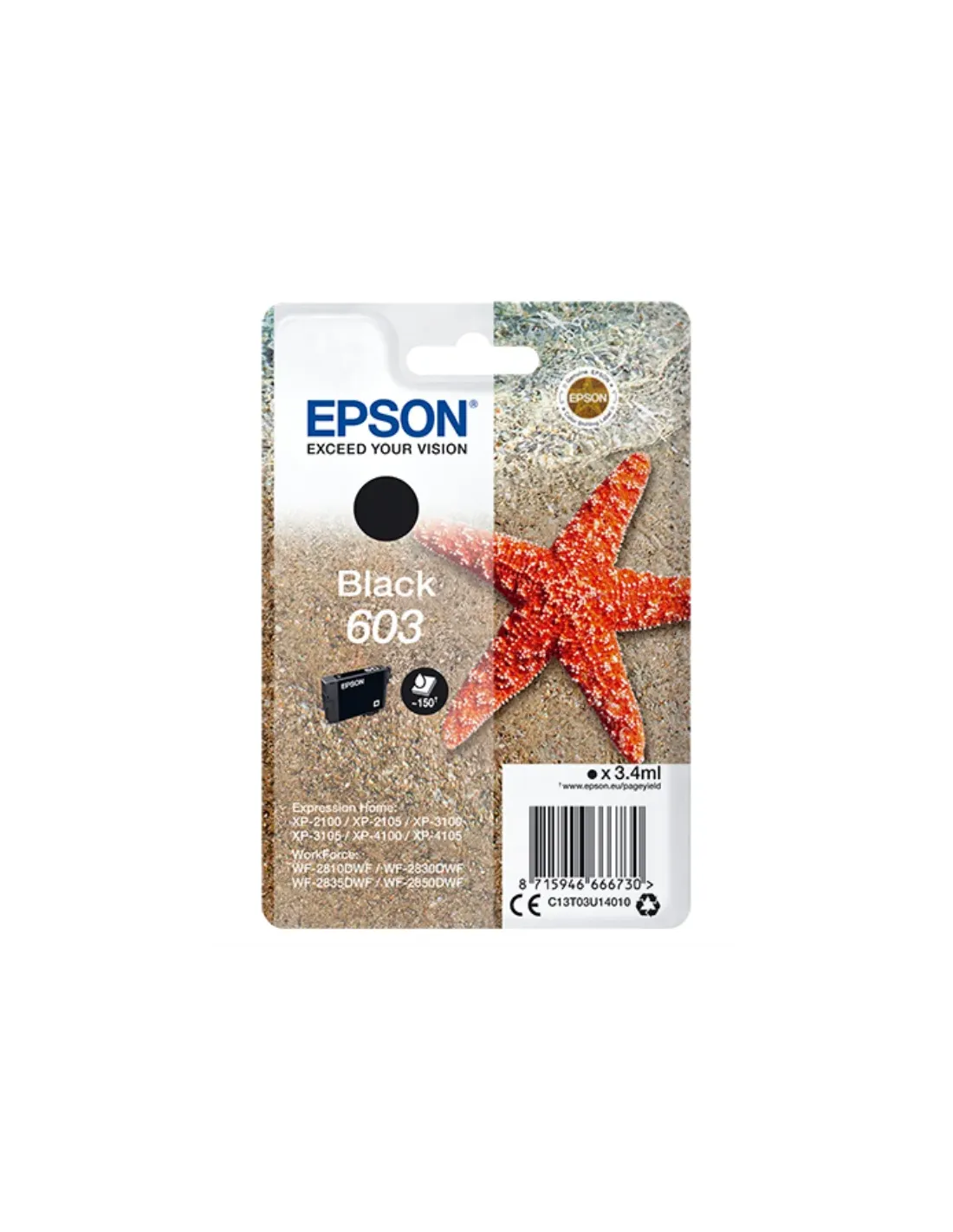 Económica y fiableDisfruta de copias fiables, nítidas y de colores vivos con una inversión mínima gracias a la tinta 603 de cuatro colores de Epson. Con la combinación de tintas negras pigmentadas y de colores de tipo colorante, este pack de tintas crea copias definidas y llenas de color.Reduce los costes de impresión con cartuchos de tinta XLEpson ofrece una amplia variedad de cartuchos de tinta estándar o de alta capacidad (XL) en sus gamas de tinta más recientes. Las tintas XL resultan ideales si imprimes grandes volúmenes y te ayudan a reducir los costes de impresión.Optimizado para impresoras EpsonLos papeles y tintas originales se han desarrollado para funcionar a la perfección con las impresoras Epson, para producir los mejores resultados una y otra vez.El artículo originalDisfruta de una impresión fiable y sin complicaciones con las tintas originales de Epson. Invertimos en exhaustivas investigaciones, en instalaciones de producción de alta tecnología y hacemos que nuestros productos se sometan a pruebas rigurosas para ofrecerte la mejor calidad.MarcaEpsonModeloC13T03U14010Características- Tipo de producto: Cartucho de tinta- Tecnología de impresión: Chorro de tinta- Color de impresión: Negro- Capacidad: 3.4 ml- Rendimiento: Hasta 150 páginas- Tipo de empaquetado: BlísterCompatibilidad- WorkForce WF-2850DWF- WorkForce WF-2835DWF- WorkForce WF-2830DWF- WorkForce WF-2810DWF - Expression Home XP-4105- Expression Home XP-4100- Expression Home XP-3105- Expression Home XP-3100- Expression Home XP-2105- Expression Home XP-2100Fecha de revisión16-10-2019 por AVN