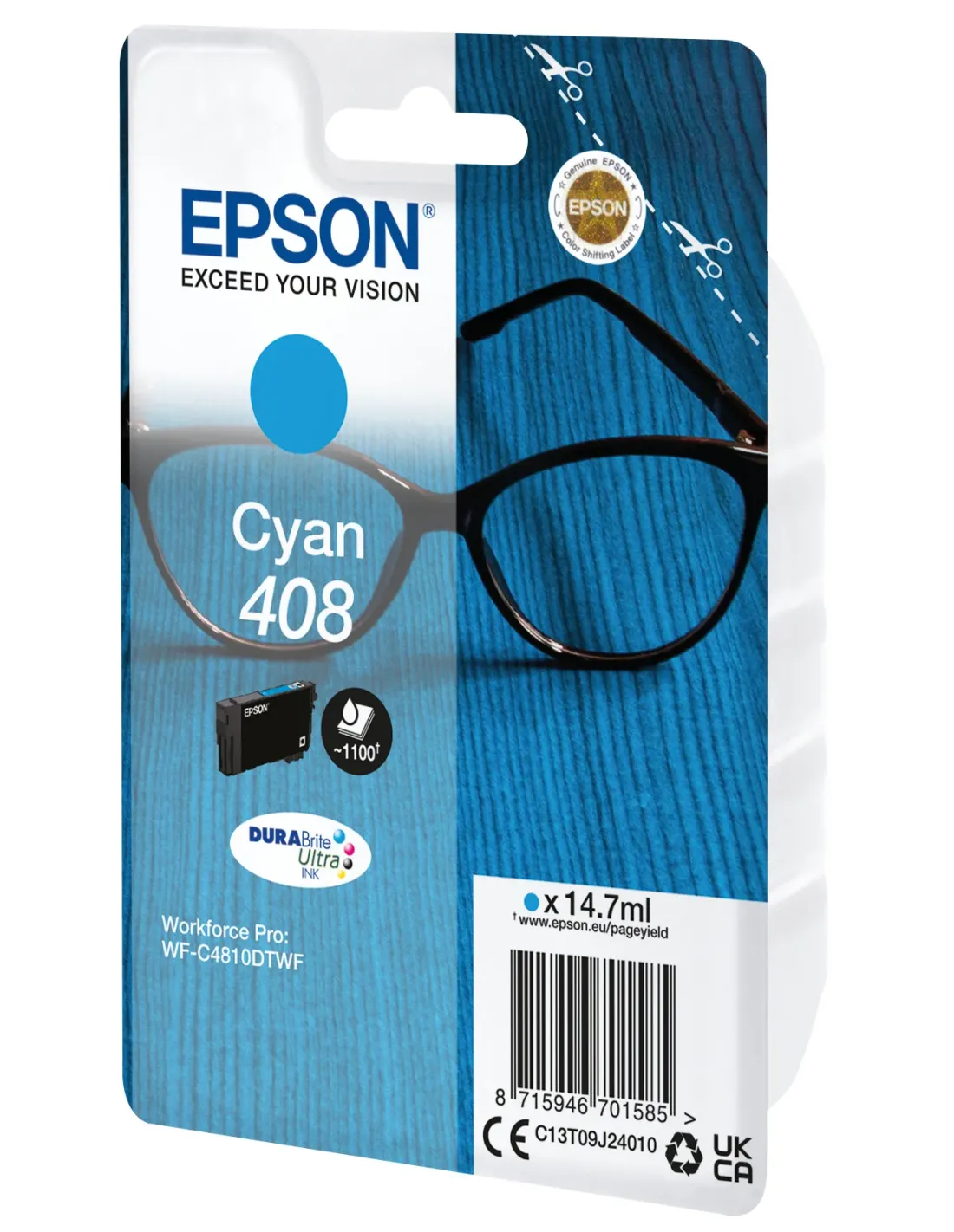 Epson Singlepack Cyan 408 DURABrite Ultra Ink, Rendimiento estándar, Cian, Tinta a base de pigmentos, 14,7 ml, 1 pieza(s), Pack individual