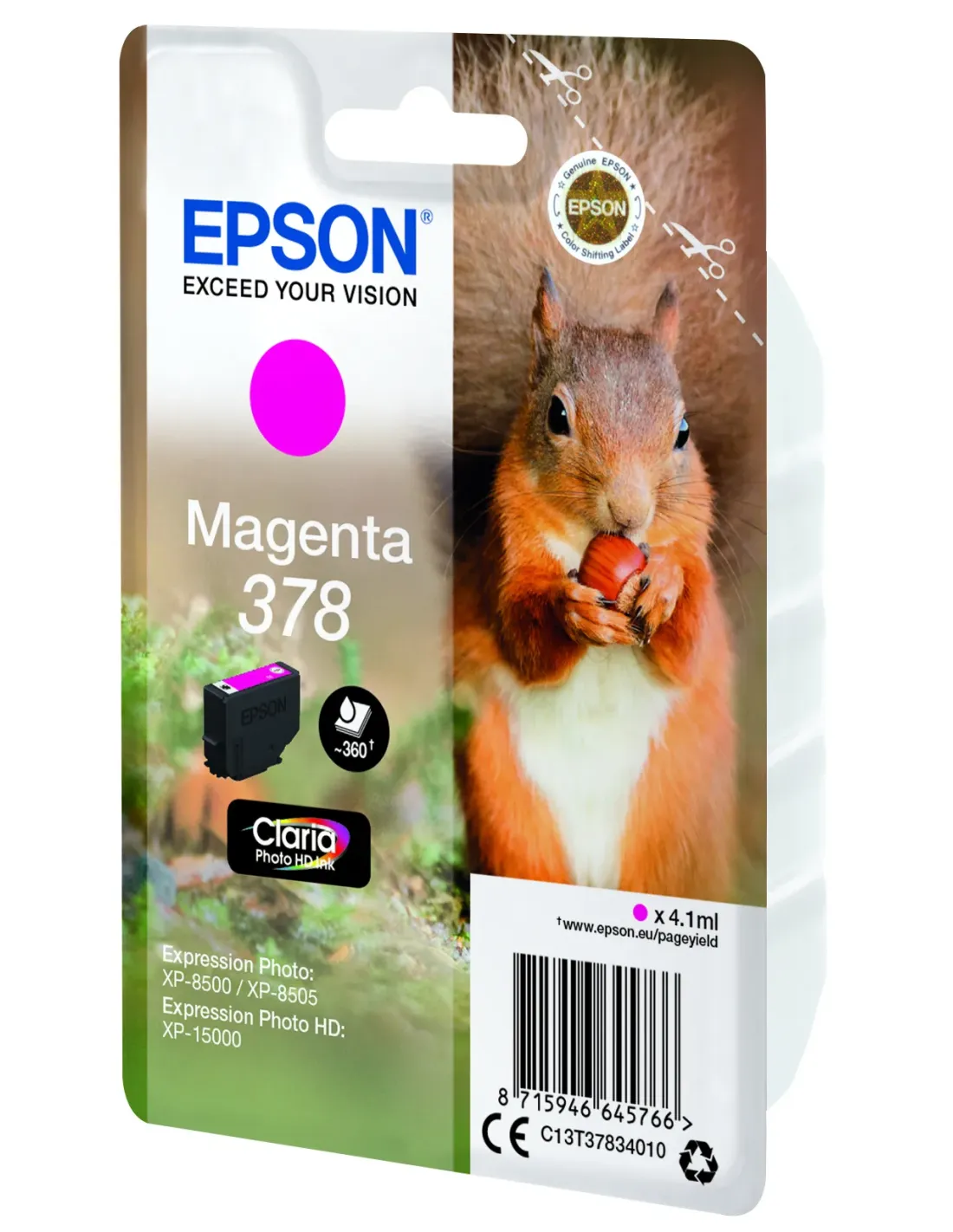 Epson Squirrel Singlepack Magenta 378 Claria Photo HD Ink, Rendimiento estándar, Magenta, Tinta a base de pigmentos, 4,1 ml, 1 pieza(s), 360 páginas