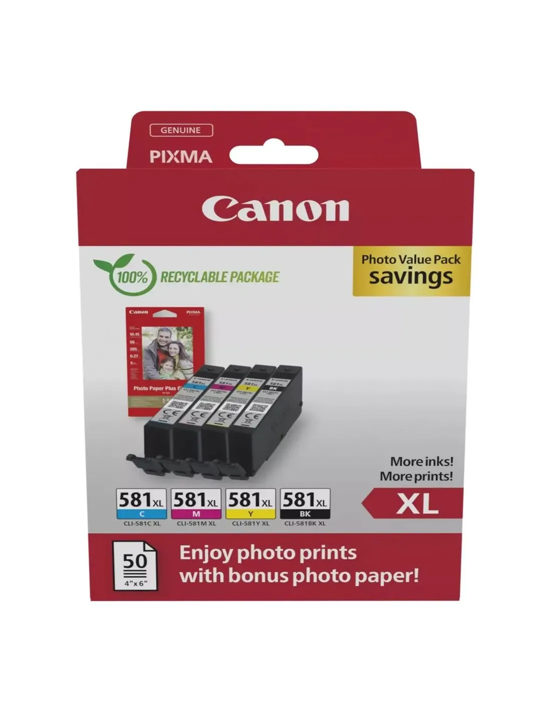 - CONTENIDO DEL PACK Tinta negra, cian, magenta y amarilla XL Pack de papel fotográfico - USO Impresión de documentos y fotos de alta calidad - CAPACIDAD Y RENDIMIENTO Cartuchos de mayor capacidad para un mejor valor Hasta el doble de impresiones en comparación con los cartuchos estándar - TECNOLOGÍA Sistema ChromaLife100 que protege las imágenes contra la pérdida de color - COMPATIBILIDAD CON PAPEL Papel fotográfico brillo II de Canon - CAPACIDAD DE TINTA 8,3 ml por cartucho - RENDIMIENTO DE IMPRESIÓN (ESTÁNDAR ISO/IEC 24711) Tinta amarilla XL: hasta 199 fotos Tinta magenta XL: hasta 225 fotos Tinta negra XL: hasta 520 fotos Tinta cian XL: hasta 170 fotos