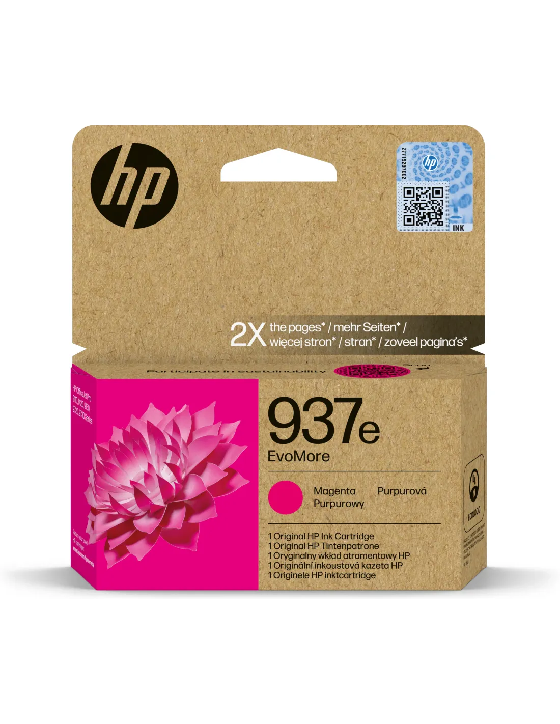 Descripción del producto HP 937e EvoMore - magenta - original - cartucho de tintaTipo de producto Cartucho de tintaTecnología de impresión Chorro de tintaColor de impresión MagentaRendimiento Hasta 1650 páginas ISO/IEC 24711Compatible con Officejet Pro 9122e, 9125e, 9135e, 9720E, 9730e
