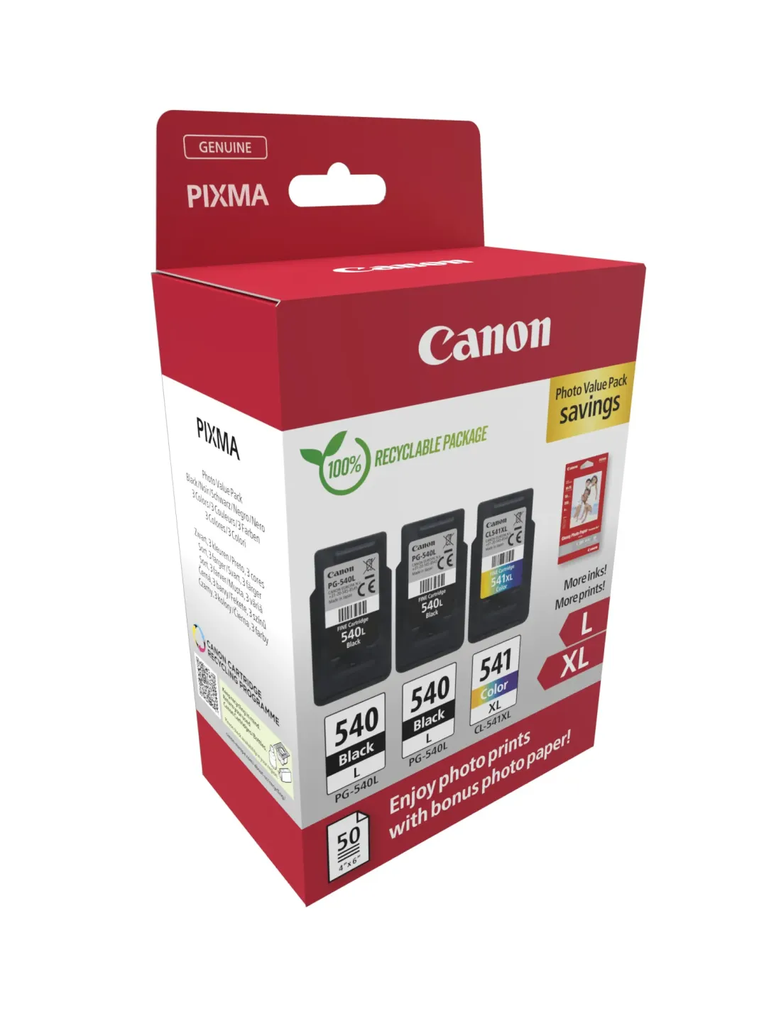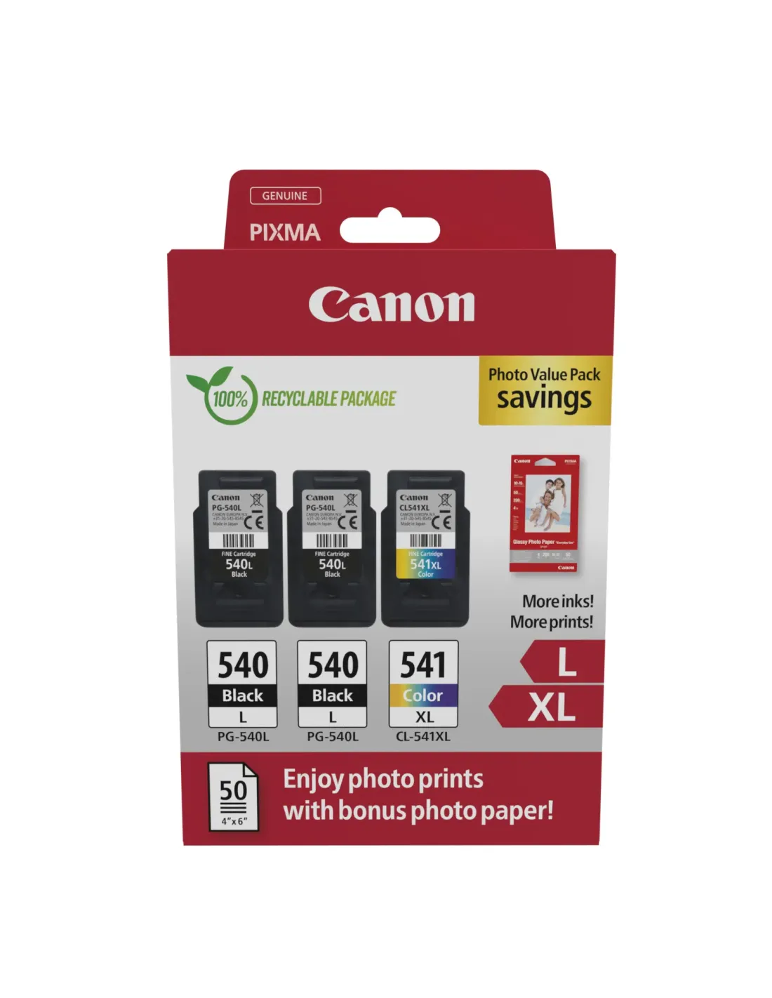 Este value pack de papel fotográfico de alto rendimiento es la solución ideal para una impresión asequible. Incluye dos packs de cartuchos de tinta negra de alto rendimiento PG-540L de 11 ml para imprimir hasta 600páginas y un pack de cartucho de color de alto rendimiento CL-541XL de 15 ml para imprimir hasta 400 páginas llenas de colores. La tinta Canon original garantiza una mayor calidad y fiabilidad, lo que significa quepuedes imprimir más por menos. El pack también incluye 50 hojas de papel fotográfico satinado GP-501 de 10 x 15 cm para conseguir impresiones con calidad de laboratorio.VentajasEl photo value pack incluye dos tintas negras y una de color, además de 50 hojas de papel fotográfico satinadoLa tinta Canon original permite imprimir, de media, hasta un 35 % más de impresiones de calidad que los cartuchos de imitaciónLa tinta Canon original ofrece impresiones con una calidad constante el 100 % de su vida útilLa tinta Canon original es 100 % fiable para que imprimas sin preocupacionesJuntos, los cartuchos de tinta negra de alto rendimiento PG-520L de 11 ml imprimirán hasta 600 páginas de documentos A4, lo que es ideal para imprimir documentos durante un periodo de tiempo prolongadoEl pack de cartuchos de tinta de color de alto rendimiento CL-541XL de 15 ml te proporcionará hasta 400 páginas de documentos A4, lo que es ideal para no quedarte nunca sin colores intensosIncluye 50 hojas de papel fotográfico satinado GP-501 de 10 x 15 cm, una forma económica de lograr impresiones fotográficas sensacionales ideales para fotos de viajes y vacacionesDevuelve cada cartucho de tinta y tóner para que se recicle o reutilice. Es gratis, fácil y respetuoso con el medio ambienteCompatibilidadPIXMA MX475PIXMA MX515PIXMA MX455PIXMA MX435PIXMA MX395PIXMA MX375PIXMA MG4250PIXMA MG4150PIXMA MG3550PIXMA MG3250PIXMA MG3150PIXMA MG2250PIXMA MG2150PIXMA MX525PIXMA MX535PIXMA TS5150PIXMA TS5151PIXMA MG3650SPIXMA MG3650