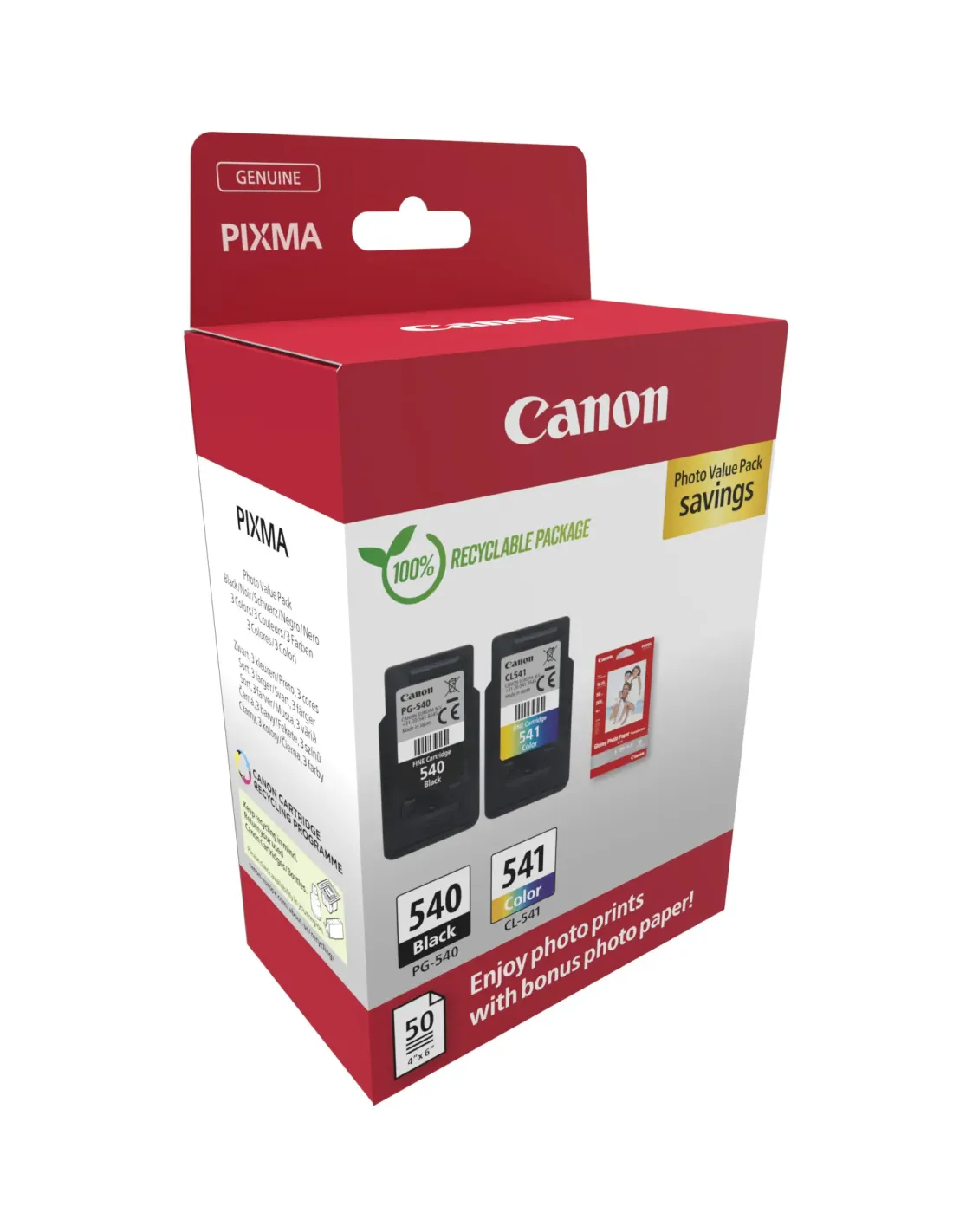 Este pack de oferta es la solución ideal para una impresión asequible. Incluye el cartucho de tinta de color CL-541 de 8 ml para imprimir hasta 180 páginas llenas de colores y un cartucho de tinta PG-540 de 8 ml paraimprimir hasta 180 páginas de negros intensos. La tinta Canon original garantiza una mayor calidad y fiabilidad, lo que significa que puedes imprimir más por menos. El pack también incluye 50 hojas de papel fotográficosatinado de 10 x 15 cm (4x6) para conseguir impresiones con calidad de laboratorio.VentajasEl pack de oferta incluye tintas negra y de color, además de 50 hojas de papel fotográfico satinadoLa tinta Canon original permite imprimir, de media, hasta un 35 % más de impresiones de calidad que los cartuchos de imitaciónLa tinta Canon original ofrece impresiones con una calidad constante el 100 % de su vida útilLa tinta Canon original es 100 % fiable para que imprimas sin preocupacionesIncluye 50 hojas de papel fotográfico satinado GP-501 de 10 x 15 cm (4x6), una forma económica de lograr impresiones fotográficas sensacionales para lograr fotos ideales de viajes y vacacionesDevuelve cada cartucho de tinta y tóner para que se recicle o reutilice. Es gratis, fácil y respetuoso con el medio ambienteCompatibilidadPIXMA MX475PIXMA MX515PIXMA MX455PIXMA MX435PIXMA MX395PIXMA MX375PIXMA MG4250PIXMA MG4150PIXMA MG3550PIXMA MG3250PIXMA MG3150PIXMA MG2250PIXMA MG2150PIXMA MX525PIXMA MX535PIXMA TS5150PIXMA TS5151PIXMA MG3650SPIXMA MG3650