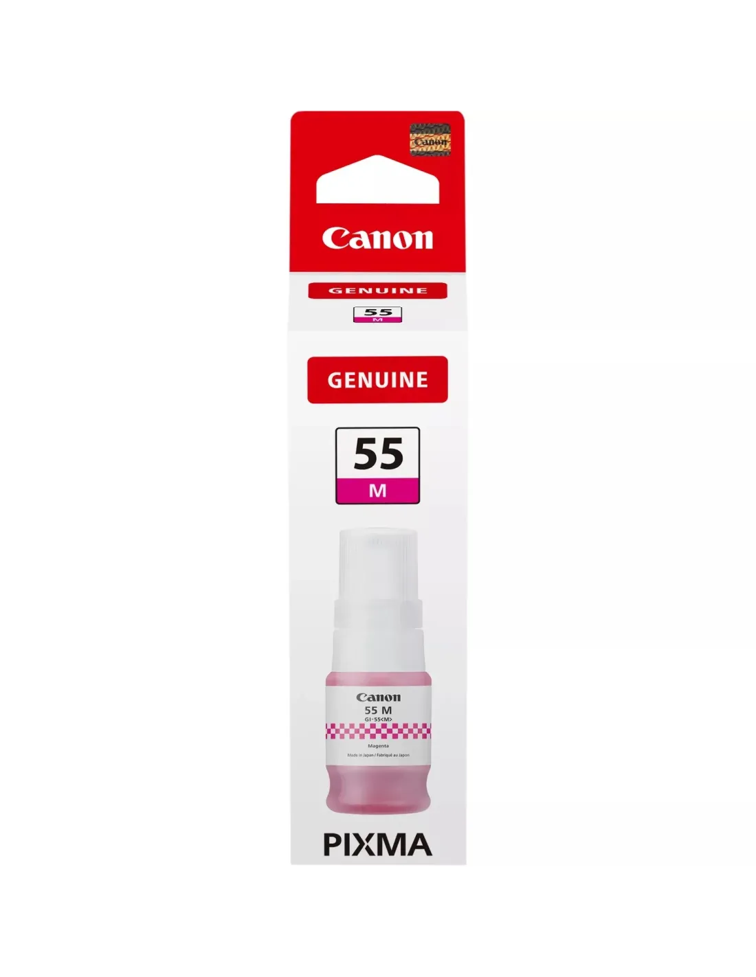 La botella de tinta magenta GI-55M de Canon contiene un pigmento nítido que permite producir documentos y fotos de calidad empresarial en casa y en el trabajo. Al combinarla con un conjunto completo de tintaspigmentadas de color, ahorrarás dinero gracias a un rendimiento de hasta 3000 páginas (hasta 4500 en el modo económico), una ventaja ideal para reducir costes a largo plazo. Por último, la tinta se beneficia del nuevoprocesamiento de imagen, lo que se traduce en documentos impresos más nítidos y duraderos.VentajasCombina la botella de tinta magenta GI-55M de 40 ml con un conjunto completo de tintas de colores para obtener un rendimiento de hasta 3000 páginas (4500 en el modo económico).El nuevo procesamiento de imágenes garantiza una impresión de documentos nítida y duradera.Gracias al diseño de la botella, no se desperdicia ni una gota al rellenar la impresora, por lo que no es necesario almacenar botellas usadas para futuros usos.Devuelve cada botella y cartucho de tinta, y cada cartucho de tóner para que se recicle o reutilice. Es gratis, fácil y respetuoso con el medio ambiente.CompatibilidadMAXIFY GX1050MAXIFY GX2050
