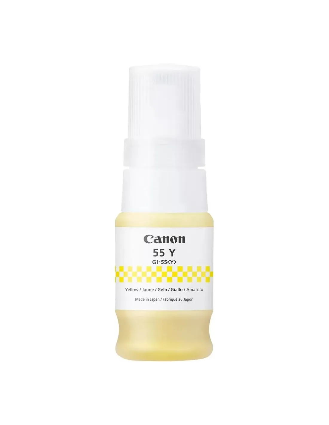 La botella de tinta amarilla GI-55Y de Canon contiene un pigmento nítido que permite producir documentos y fotos de calidad empresarial en casa y en el trabajo. Al combinarla con un conjunto completo de tintaspigmentadas de color, ahorrarás dinero gracias a un rendimiento de hasta 3000 páginas (hasta 4500 en el modo económico), una ventaja ideal para reducir costes a largo plazo. Por último, la tinta se beneficia del nuevoprocesamiento de imagen, lo que se traduce en documentos impresos más nítidos y duraderos.VentajasCombina la botella de tinta amarilla GI-55Y de 40 ml con un conjunto completo de tintas de colores para obtener un rendimiento de hasta 3000 páginas (4500 en el modo económico).El nuevo procesamiento de imágenes garantiza una impresión de documentos nítida y duradera.Gracias al diseño de la botella, no se desperdicia ni una gota al rellenar la impresora, por lo que no es necesario almacenar botellas usadas para futuros usos.Devuelve cada botella y cartucho de tinta, y cada cartucho de tóner para que se recicle o reutilice. Es gratis, fácil y respetuoso con el medio ambiente.CompatibilidadMAXIFY GX1050MAXIFY GX2050
