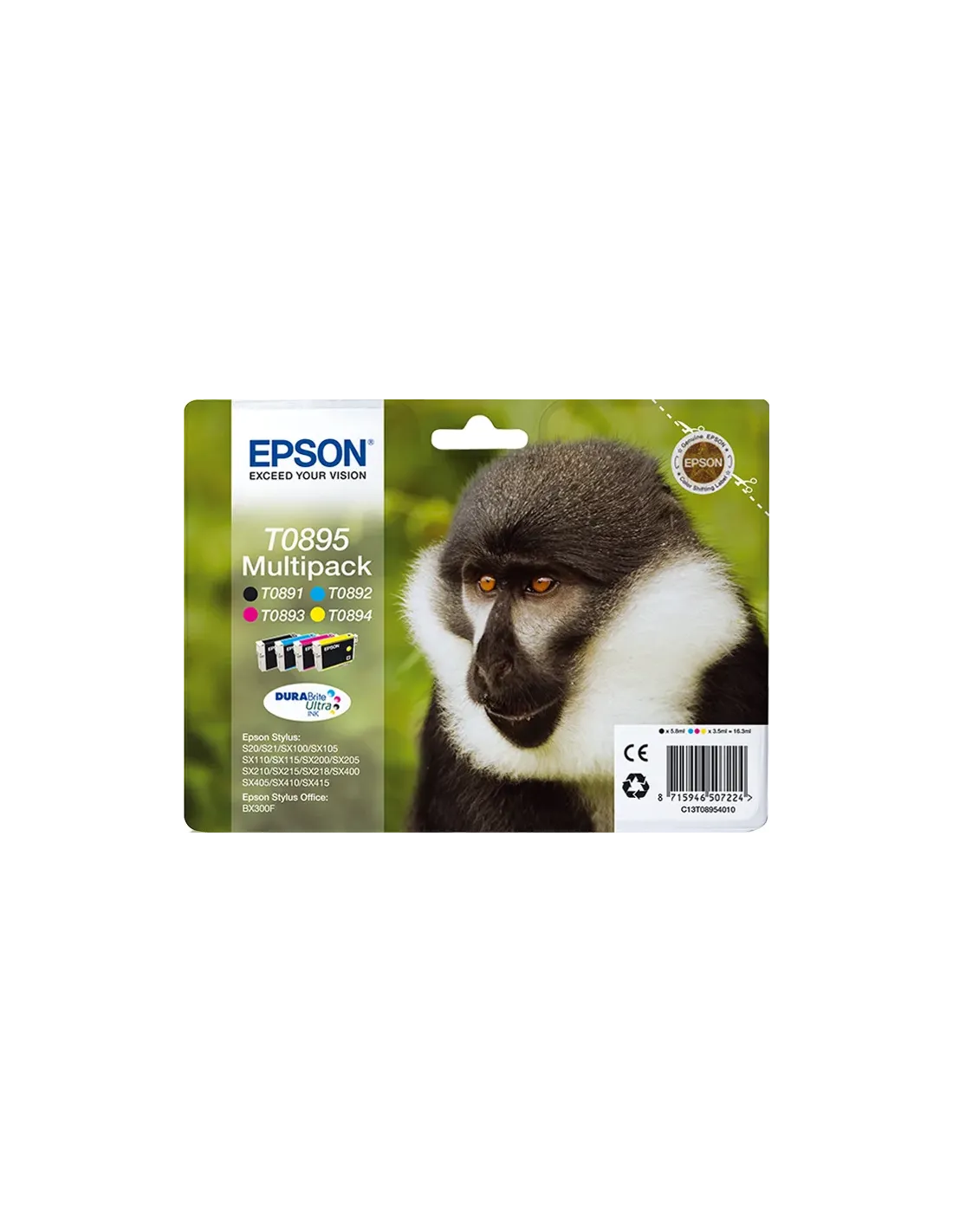 CaracterísticasTipo OriginalCódigo OEM C13T08954010Tipo de tinta Pigment-based inkVolumen de tinta negra 5.8 mlCantidad de cartuchos de tinta negra 1Volumen de tinta de color 3.5 mlCantidad de cartuchos de tinta de color 3Tipo de suministro Multi packDatos logísticosCantidad por palé 864 pieza(s)Cantidad mínima del pedido 8 pieza(s)Anchura del palé 800 mmLongitud del palé 1200 mmAltura del palé 436 mmCantidad por capa de palet 96 pieza(s)Cantidad por capa de palé (Reino Unido) 96 pieza(s)Cantidad por palé (Reino Unido) 864 pieza(s)Longitud del palé (Reino Unido) 1200 mmAnchura del palé (Reino Unido) 1000 mmAltura del palé (Reino Unido) 436 mmDesempeñoColor YTecnología de impresión Inkjet printingColores de impresión Black,Cyan,Magenta,YellowPaís de origen ChinaMarca compatible EpsonDetalles técnicosCódigo de Sistema de Armomización (SA) 84439990EmpaquetadoPeso del paquete 0.144 gProfundidad del paquete 46 mmAltura del paquete 195 mmAncho del paquete 150 mmCantidad por paquete 1 pieza(s)Peso y dimensionesTipo de embalaje Blister