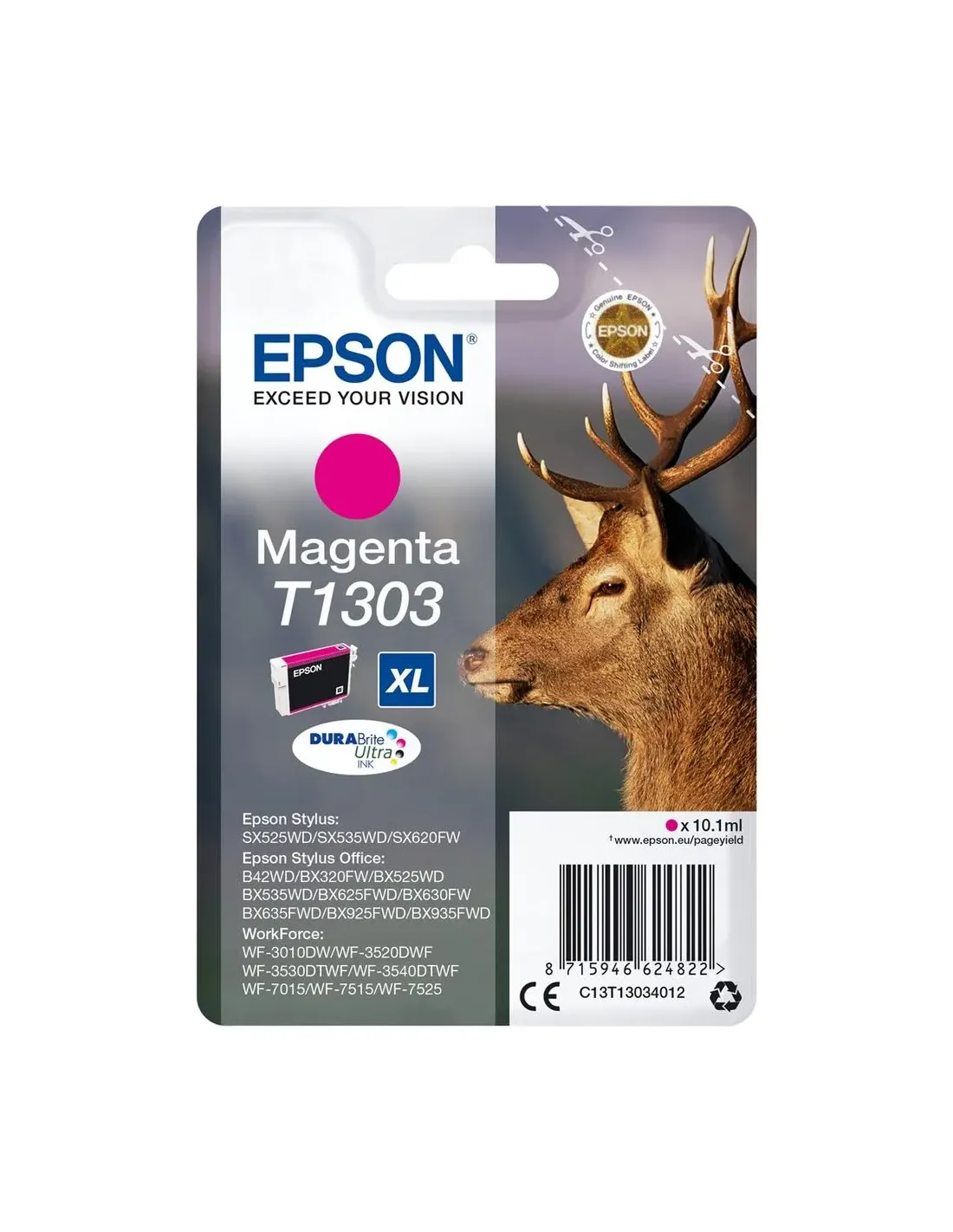 CaracterísticasTipo OriginalTipo de cartucho de tinta High (XL) YieldCódigo OEM C13T13034012Tipo de tinta Pigment-based inkVolumen de tinta de color 10.1 mlRendimiento de impresión de página con tinta de color 600 páginasCantidad de cartuchos de tinta de color 1Tipo de tinta de color Pigment-based inkDatos logísticosCantidad por palé 2720 pieza(s)Alto de la caja principal 146 mmAncho de la caja principal 102 mmCantidad mínima del pedido 8 pieza(s)Anchura del palé 800 mmLongitud del palé 1200 mmAltura del palé 600 mmLongitud de la caja 260 mmCantidad por caja 8 pieza(s)Cantidad por capa de palet 272 pieza(s)Cantidad por capa de palé (Reino Unido) 272 pieza(s)Cantidad por palé (Reino Unido) 2720 pieza(s)DesempeñoTecnología de impresión Inkjet printingColores de impresión MagentaPaís de origen United KingdomMarca compatible EpsonDetalles técnicosCaja GTIN (EAN/UPC) 8715946627588Código de Sistema de Armomización (SA) 84439990EmpaquetadoPeso del paquete 50 gProfundidad del paquete 32 mmAltura del paquete 145 mmAncho del paquete 102 mmCantidad por paquete 1 pieza(s)Peso y dimensionesTipo de embalaje Blister