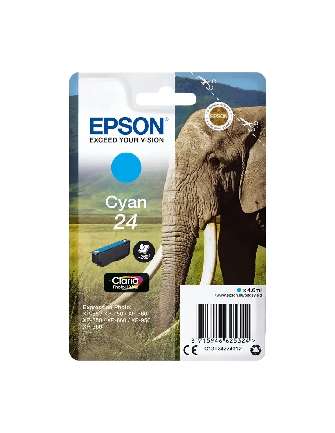 CaracterísticasTipo OriginalCertificación CECódigo OEM C13T24224012Tipo de tinta Dye-based inkVolumen de tinta de color 4.6 mlRendimiento de impresión de página con tinta de color 360 páginasCantidad de cartuchos de tinta de color 1Tipo de tinta de color Dye-based inkTipo de cartucho de tinta Standard YieldDatos logísticosCantidad por palé 3400 pieza(s)Alto de la caja principal 146 mmAncho de la caja principal 102 mmCantidad mínima del pedido 10 pieza(s)Anchura del palé 800 mmLongitud del palé 1200 mmAltura del palé 390 mmLongitud de la caja 260 mmCantidad por caja 10 pieza(s)Cantidad por capa de palet 340 pieza(s)Cantidad por capa de palé (Reino Unido) 340 pieza(s)Cantidad por palé (Reino Unido) 3400 pieza(s)Longitud del palé (Reino Unido) 1200 mmAnchura del palé (Reino Unido) 1000 mmAltura del palé (Reino Unido) 2000 mmDesempeñoTecnología de impresión Inkjet printingCompatibilidad - Expression Photo XP-960 - Expression Photo XP-950 - Expression Photo XP-860 - Expression Photo XP-760 - Expression Photo XP-55 - Epson Expression Photo XP-850 - Epson Expression Photo XP-750Colores de impresión CyanPaís de origen IndonesiaMarca compatible EpsonDetalles técnicosCaja GTIN (EAN/UPC) 8715946627205Código de Sistema de Armomización (SA) 84439990EmpaquetadoPeso del paquete 34 gProfundidad del paquete 141 mmAltura del paquete 24 mmAncho del paquete 97 mmCantidad por paquete 1 pieza(s)Peso y dimensionesTipo de embalaje Blister
