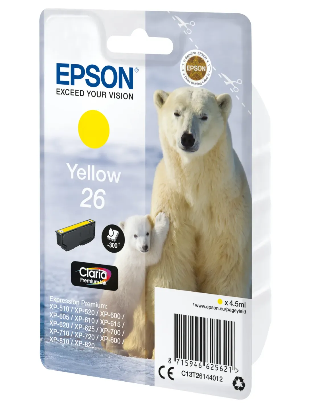 Epson Polar bear Cartucho 26 amarillo, Rendimiento estándar, Amarillo, Tinta a base de pigmentos, 4,5 ml, 1 pieza(s), 300 páginas
