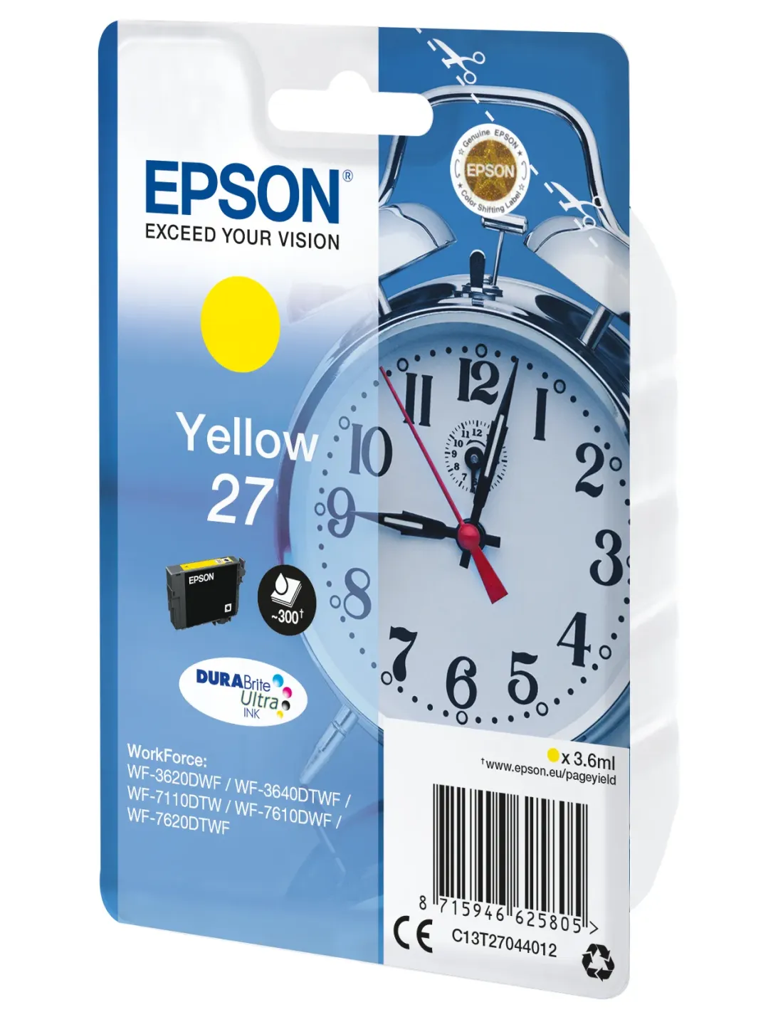 Epson Alarm clock Singlepack Yellow 27 DURABrite Ultra Ink, Rendimiento estándar, Amarillo, Tinta a base de pigmentos, 3,6 ml, 1 pieza(s), 300 páginas