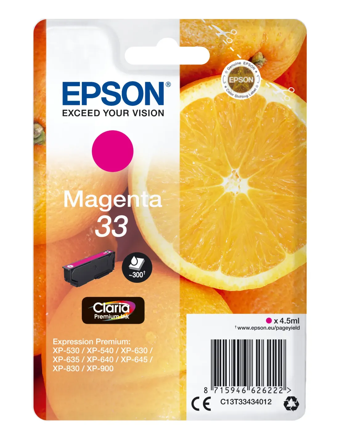 Epson Oranges Singlepack Magenta 33 Claria Premium Ink, Rendimiento estándar, Magenta, Tinta a base de pigmentos, 4,5 ml, 1 pieza(s), 300 páginas