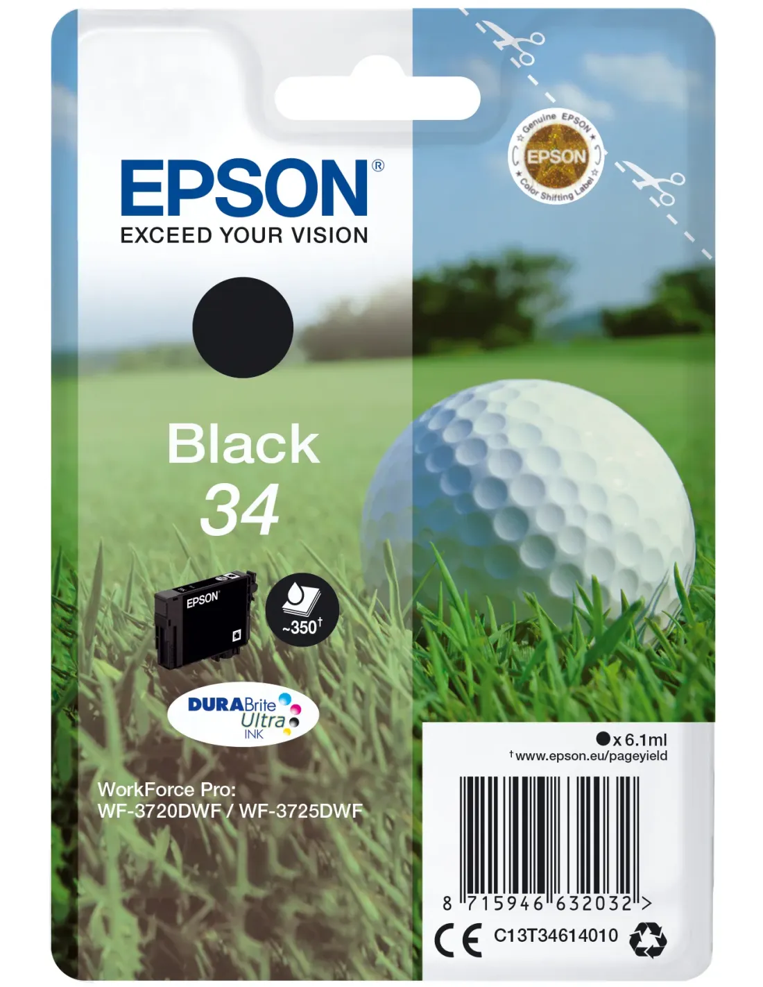 Epson Golf ball Singlepack Black 34 DURABrite Ultra Ink, Rendimiento estándar, Negro, Tinta a base de pigmentos, 6,1 ml, 1 pieza(s), 350 páginas