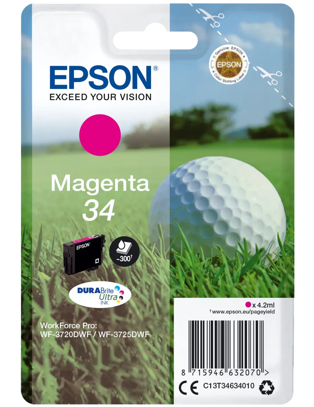 Epson Golf ball Singlepack Magenta 34 DURABrite Ultra Ink, Rendimiento estándar, Magenta, Tinta a base de pigmentos, 4,2 ml, 1 pieza(s), 300 páginas