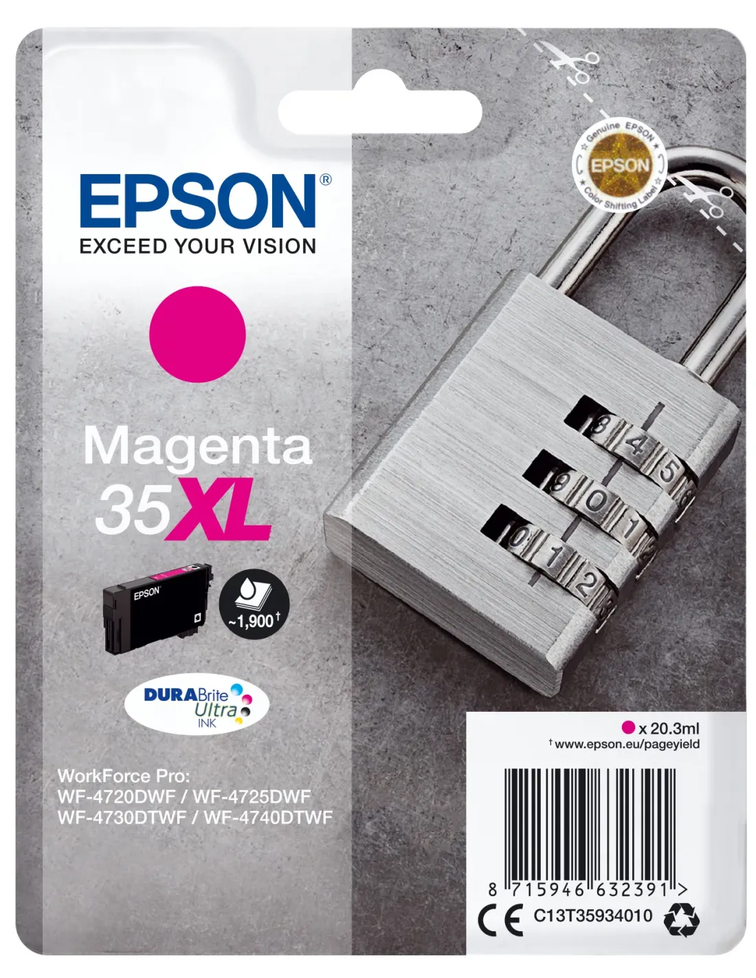 Epson Padlock Singlepack Magenta 35XL DURABrite Ultra Ink, Alto rendimiento (XL), Magenta, Tinta a base de pigmentos, 20,3 ml, 1 pieza(s), 1900 páginas