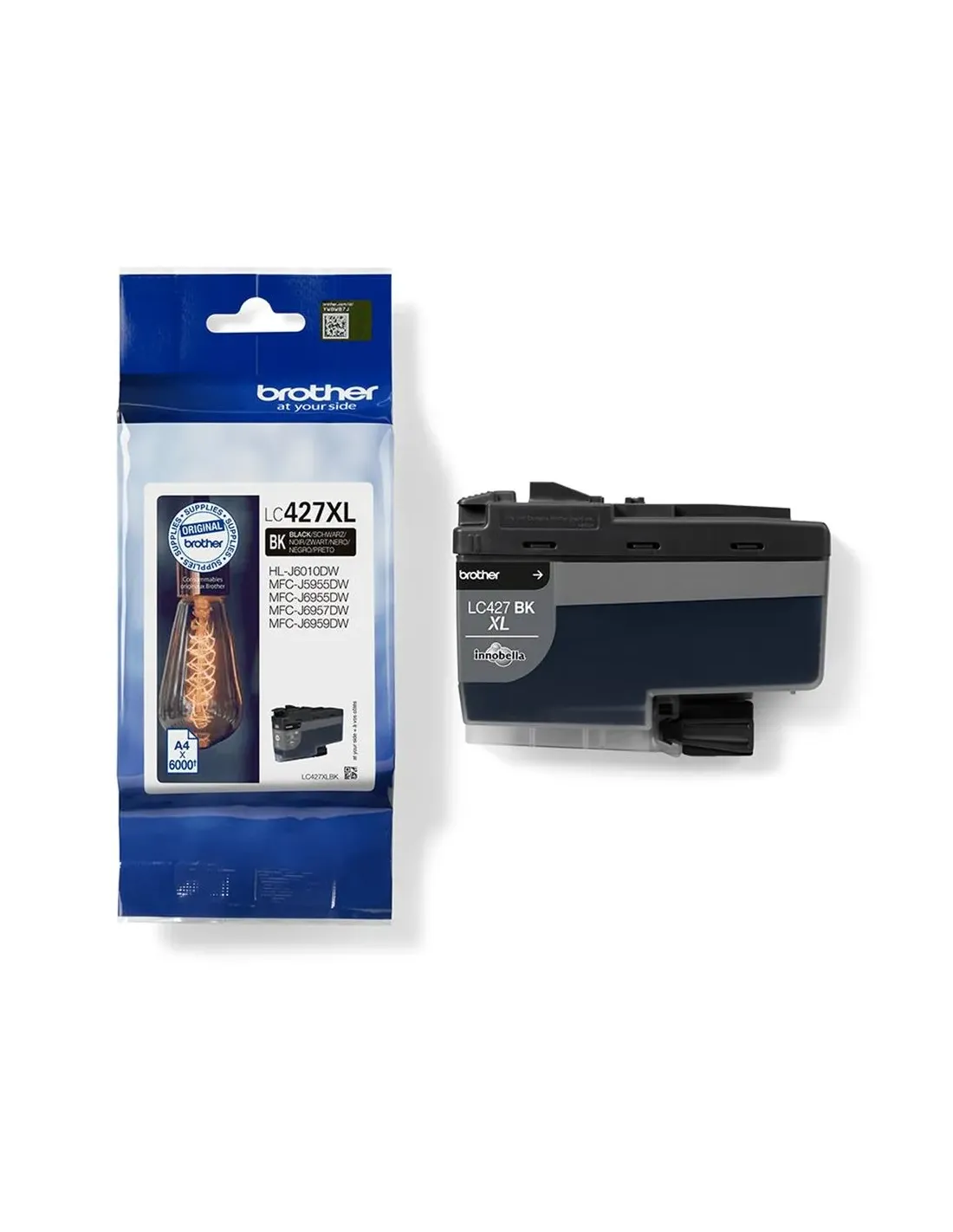 Características del Cartucho Brother LC427XLBK Negro XLEl cartucho **Brother LC427XLBK** es la opción ideal para quienes buscan **impresiones profesionales de larga duración** y una excelente relación calidad-precio. Diseñado para equipos de inyección de tinta Brother, este cartucho negro de alta capacidad garantiza resultados nítidos, duraderos y con un rendimiento optimizado gracias a su **tinta pigmentada**.Alto rendimiento y tinta de calidad profesionalCon una autonomía de hasta 6.000 páginas según la norma ISO/IEC 24711, este cartucho es perfecto para entornos donde se requiere un volumen de impresión elevado sin comprometer la calidad. La tinta pigmentada proporciona textos más definidos y una mayor resistencia al agua y a la decoloración.Rendimiento estimado: 6.000 páginasTinta pigmentada para resultados más duraderosCalidad profesional para documentos en blanco y negroDiseño eficiente y orientado al ahorroGracias a su sistema de cartuchos individuales, solo tendrás que reemplazar el color agotado, lo que reduce costes y evita desperdicios. Además, incorpora un modo de ahorro de tinta que prolonga la vida útil del consumible y mejora el rendimiento general del equipo.Cartuchos independientes por colorModo de ahorro para reducir el consumo de tintaSustitución rápida desde el frontal de la impresoraCompatibilidad y facilidad de usoCompatible con impresoras de la serie Brother que utilizan la gama LC427, este cartucho está diseñado para una instalación sencilla y sin complicaciones, directamente desde el frontal del equipo. Ideal para usuarios que buscan comodidad y eficiencia en su día a día.Instalación fácil y accesibleCompatible con impresoras Brother LC427Diseño optimizado para uso doméstico o profesionalOtras especificacionesCódigo de producto: LC427XLBKColor: NegroTipo: Cartucho de tinta original Brother