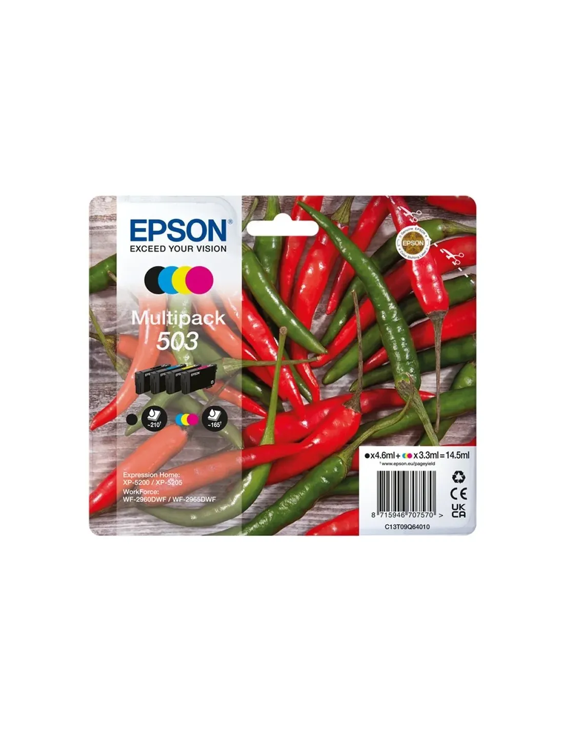 Impresión económica y fiableDisfruta de copias fiables con una inversión mínima gracias a las tintas 503 en cuatro colores de Epson. Con la combinación de tintas negras pigmentadas y de colores a base de colorante, este pack de tintas genera impresiones nítidas y de colores vivos.Reduce los costes de impresión con cartuchos de tinta XLSe suministran de forma individual, por lo que solo tienes que sustituir el color agotado. Además, con los cartuchos XL puedes imprimir hasta 550 páginas en negro y 470 en color.Optimizado para impresoras EpsonLos papeles y tintas originales de Epson se han desarrollado para funcionar a la perfección con las impresoras Epson, para producir los mejores resultados de forma continua. Epson también ofrece un programa de reciclaje de cartuchos de tinta.El artículo originalDisfruta de una impresión fiable y sin complicaciones con las tintas originales de Epson. Invertimos en exhaustivas investigaciones, en instalaciones de producción de alta tecnología y sometemos a nuestros productos a pruebas rigurosas para ofrecerte la mejor calidad.Embalaje original EasyMail de EpsonPuedes recibir las compras de tinta online cómodamente en casa gracias al embalaje EasyMail. Hemos diseñado el embalaje para que sea lo bastante compacto como para caber en la mayoría de buzones. Así evitamos desplazamientos innecesarios para recoger las entregas. Marca Epson Modelo C13T09Q14010 Características - Color: multipack (negro, cián, amarillo, magenta) - Hasta hasta 550 páginas en negro y 470 en color - Cartucho de tinta serie 503 Compatible con: - Expression Home XP-5205 - WorkForce WF-2960DWF - WorkForce WF-2965DWF Fecha de revisión 02-09-2022 por MPM