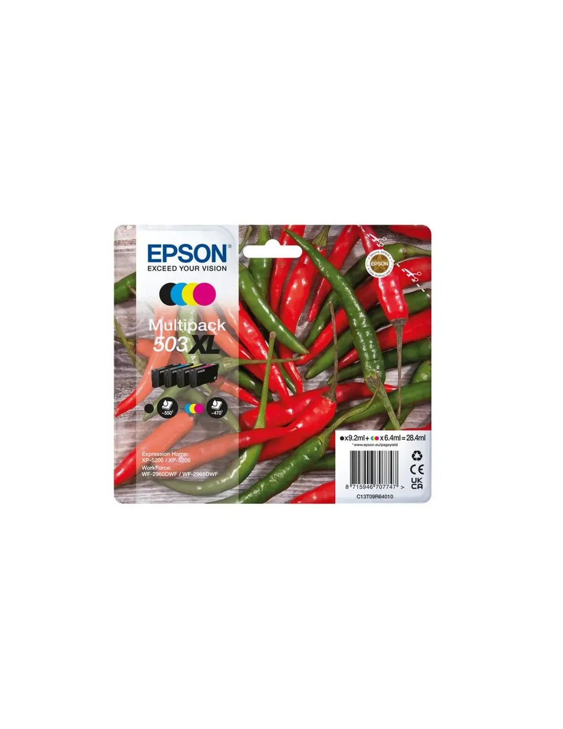 Características del EPSON Cartucho 4 colores Multipack 503XL Negro y 503CMY Standard PimientoEl EPSON Multipack 503XL + 503CMY es la solución original perfecta para quienes buscan impresiones nítidas, colores intensos y un rendimiento fiable en el día a día. Diseñado específicamente para impresoras Epson Expression Home y WorkForce compatibles, este pack incluye tinta negra de alta capacidad (XL) junto a cartuchos de color cian, magenta y amarillo, garantizando resultados consistentes tanto en documentos como en gráficos e imágenes.Multipack original Epson: máxima compatibilidad y calidadAl tratarse de cartuchos originales Epson, están optimizados para trabajar en perfecta armonía con tu impresora, evitando problemas de reconocimiento, fugas o pérdida de calidad. La tecnología de tinta Epson ofrece textos definidos y colores equilibrados desde la primera hasta la última página.Tipo: OriginalTipo de suministro: Multi pack (4 cartuchos)Colores de impresión: Black, Cyan, Magenta, YellowMarca compatible: EpsonAlto rendimiento para impresión diariaEl cartucho negro 503XL de alta capacidad (High XL Yield) permite imprimir un mayor número de páginas, ideal para entornos domésticos con alto volumen o pequeñas oficinas. Los cartuchos de color ofrecen un equilibrio perfecto entre rendimiento y calidad de imagen.Volumen de tinta negra: 9,2 mlRendimiento tinta negra: hasta 550 páginasVolumen de tinta color: 6,4 ml por cartuchoRendimiento tinta color: hasta 470 páginasCantidad de cartuchos negros: 1Cantidad de cartuchos de color: 3Compatibilidad aseguradaEste multipack está diseñado para ofrecer ajuste perfecto y funcionamiento estable en los siguientes modelos Epson, asegurando una instalación rápida y sin complicaciones:Epson Expression Home XP-5200Epson Expression Home XP-5205Epson WorkForce WF-2960DWFEpson WorkForce WF-2965DWFContenido del paqueteEl pack incluye todo lo necesario para renovar completamente los consumibles de tu impresora y mantenerla lista para cualquier tarea.Cantidad por paquete: 4 pieza(s)