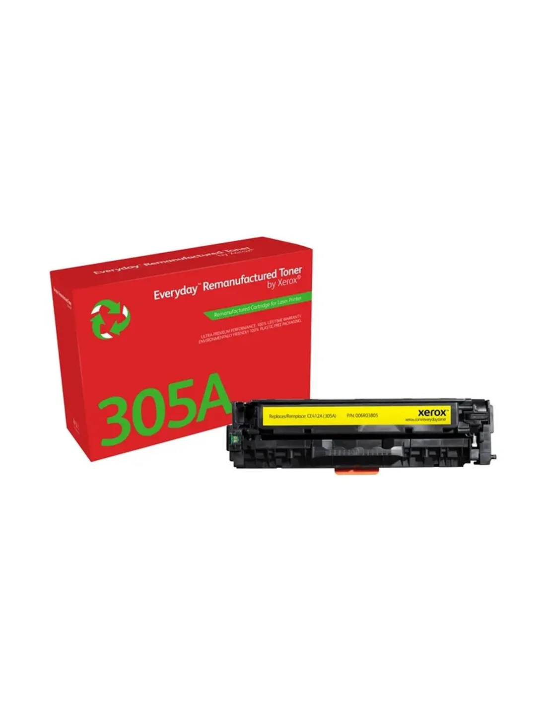 Características del Tóner Remanufacturado Xerox Everyday Amarillo para HP 305A (CE412A)El cartucho de tóner **Xerox Everyday Amarillo** es la alternativa perfecta y ecológica al modelo original **HP 305A (CE412A)**. Diseñado para usuarios que buscan **ahorro sin renunciar a la calidad**, es totalmente compatible con impresoras HP LaserJet Pro de las series **300 y 400**, ofreciendo un rendimiento fiable para entornos de oficina o uso profesional.Ahorro inteligente con garantía de confianzaEste cartucho remanufacturado permite **ahorrar entre un 35 % y un 45 %** en comparación con los consumibles originales, sin comprometer el rendimiento ni la calidad de impresión. Además, cuenta con **protección de por vida** y reemplazo gratuito en caso de fallos, lo que ofrece total tranquilidad durante su uso.Alternativa al HP 305A (CE412A)Compatible con impresoras HP LaserJet Pro 300/400Reemplazo gratuito garantizado ante cualquier problemaCompromiso medioambiental sin renunciar a la calidadFabricado con un enfoque sostenible, el tóner Xerox Everyday reduce significativamente el uso de recursos naturales y la huella de carbono. Además, se puede reciclar fácilmente mediante el Programa de Reciclaje de Suministros de Xerox, lo que lo convierte en una opción **responsable y ecológica**.Tóner remanufacturado con menor impacto ambientalMateriales seguros y aprobados por Xerox SafetyOportunidad de reciclar a través del programa oficial de XeroxCompatibilidad con impresoras HPEste cartucho es 100 % compatible con los siguientes modelos de impresoras HP LaserJet Pro:HP LaserJet Pro 300 Color M351HP LaserJet Pro 400 Color M451HP LaserJet Pro 400 Color MFP M375HP LaserJet Pro 400 Color MFP M475Otras especificacionesReferencia del fabricante: 006R03805Color: AmarilloTipo: Tóner remanufacturado de rendimiento estándarSerie original equivalente: HP 305A (CE412A)