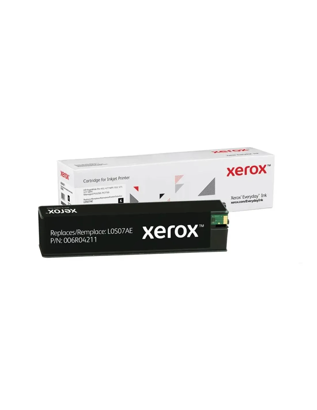 Cartucho de Tinta Xerox Everyday 006R04211 para HP PageWide Pro 452/477El **cartucho Xerox Everyday 006R04211** es una alternativa fiable y económica para impresoras HP PageWide Pro. Diseñado para ofrecer **impresiones de alta calidad a un coste reducido**, este cartucho compatible con el modelo HP L0S07AE proporciona un rendimiento alto con una calidad de impresión consistente. Ideal para entornos de oficina o usuarios que imprimen frecuentemente y desean reducir costes sin renunciar a resultados profesionales.Ahorro sin comprometer la calidadGracias a su excelente relación calidad-precio, la gama Xerox Everyday permite reducir significativamente los gastos de impresión. Con este modelo ahorrarás entre un **50 % y un 60 % respecto a los cartuchos originales**, sin sacrificar calidad.Compatible con HP PageWide Pro 452 y 477Equivalente al cartucho HP L0S07AEAlto rendimiento: mayor cantidad de impresiones por cartuchoCalidad fiable en cada páginaEste cartucho ofrece resultados profesionales con **negros profundos, líneas precisas y textos definidos**, ideal para documentos de uso diario o presentaciones internas. Está fabricado para garantizar un rendimiento uniforme desde la primera hasta la última página.Tinta negra de alta densidadImpresión nítida y uniformeCompatible con dispositivos HP PageWide seleccionadosGarantía y compromiso con el medio ambienteXerox incluye una **garantía de por vida** en su gama Everyday: si surge cualquier problema, el cartucho será reemplazado sin coste. Además, puedes contribuir al cuidado del entorno mediante el **programa de reciclaje de consumibles** de Xerox, fácil y sin complicaciones.Cartucho de repuesto gratuito ante cualquier incidenciaPrograma de reciclaje de Xerox incluidoFabricado bajo estándares medioambientales responsablesOtras especificacionesReferencia: 006R04211Color: NegroTipo: Compatible (no original)Equivalente a: HP L0S07AE