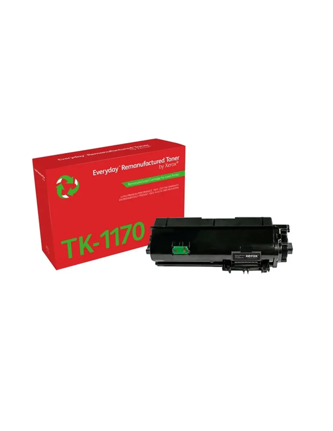 Características del XEROX Everyday Remanufactured Tóner Negro para Kyocera TK-1170El **tóner remanufacturado Xerox Everyday para Kyocera TK-1170** es la solución ideal para quienes buscan una alternativa más sostenible y económica sin renunciar a la calidad de impresión. Diseñado para ofrecer un rendimiento fiable en entornos de oficina, este cartucho proporciona resultados consistentes con un menor impacto medioambiental y un ahorro significativo frente a los consumibles originales.Impresión fiable con conciencia ecológicaEste tóner remanufacturado se produce con menos recursos naturales y está pensado para quienes quieren reducir su huella de carbono sin perder productividad. Además, cuenta con materiales aprobados por los estándares de seguridad de Xerox, garantizando un uso seguro y respetuoso con el medio ambiente.Fabricado con procesos que reducen el uso de recursos y emisionesComponentes verificados por Xerox Safety, cumpliendo los estándares del sectorCompatible con el programa de reciclaje de suministros de XeroxAhorro real con garantía incluidaCon un ahorro estimado del **35% al 45%** frente a los cartuchos originales, esta opción remanufacturada no solo cuida tu presupuesto, sino que también está respaldada por una garantía de por vida. En caso de cualquier problema, Xerox proporciona reemplazo gratuito del cartucho afectado.Ahorro significativo frente a consumibles originalesCobertura total con garantía de por vidaReemplazo gratuito ante cualquier defectoCompatibilidad y usoEste cartucho es **compatible con impresoras Kyocera que utilizan el modelo TK-1170**, proporcionando un rendimiento de calidad estándar para documentos de uso diario.Modelo de referencia: 006R04796Color: NegroTipo: Tóner remanufacturado estándarCompatibilidad: Sustituye a Kyocera TK-1170Otras especificacionesMarca: Xerox Everyday?Tipo de producto: Cartucho de tóner remanufacturadoPrograma de reciclaje incluido