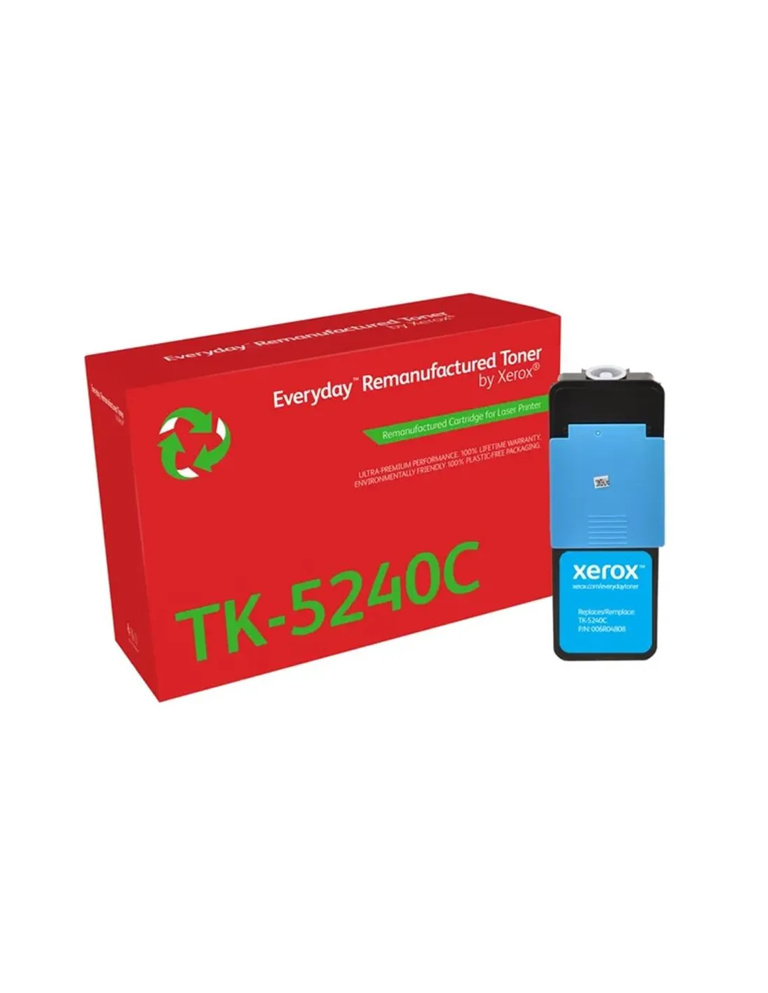 Características del Tóner Xerox Everyday Cian Remanufacturado para Kyocera TK-5240CEl **tóner remanufacturado Xerox Everyday Cian** es la alternativa perfecta para quienes buscan un consumible más sostenible y económico sin renunciar a la calidad. Diseñado para impresoras compatibles con el modelo **Kyocera TK-5240C**, ofrece un rendimiento estándar ideal para entornos de oficina que imprimen con regularidad. Su composición respeta estrictos estándares de seguridad y sostenibilidad, posicionándolo como una opción inteligente y responsable frente a los consumibles originales.Impresión fiable y respetuosa con el medio ambienteGracias a su proceso de remanufacturación, este tóner requiere menos recursos naturales en su producción, lo que se traduce en una **menor huella de carbono**. Está fabricado bajo los **criterios de calidad y seguridad de Xerox**, lo que garantiza impresiones limpias y profesionales sin riesgos para tu equipo ni para el entorno.Remanufacturado con menor impacto ambientalMateriales certificados por Xerox SafetyCompatible con el programa de reciclaje de suministros de XeroxAhorro sin comprometer el rendimientoEste consumible permite ahorrar entre un **35 % y un 45 % respecto al tóner original**, manteniendo un rendimiento óptimo en volumen de impresión. Además, incluye **garantía de por vida** con reemplazo gratuito en caso de cualquier inconveniente, lo que aporta tranquilidad y confianza al usuario profesional.Ahorro significativo frente a cartuchos originalesRendimiento estándar para trabajos de oficinaCobertura total: reemplazo gratuito si presenta algún falloOtras especificacionesCódigo del fabricante: 006R04808Color: CianTipo: Tóner remanufacturado (Xerox Everyday?)Compatibilidad: Kyocera TK-5240C