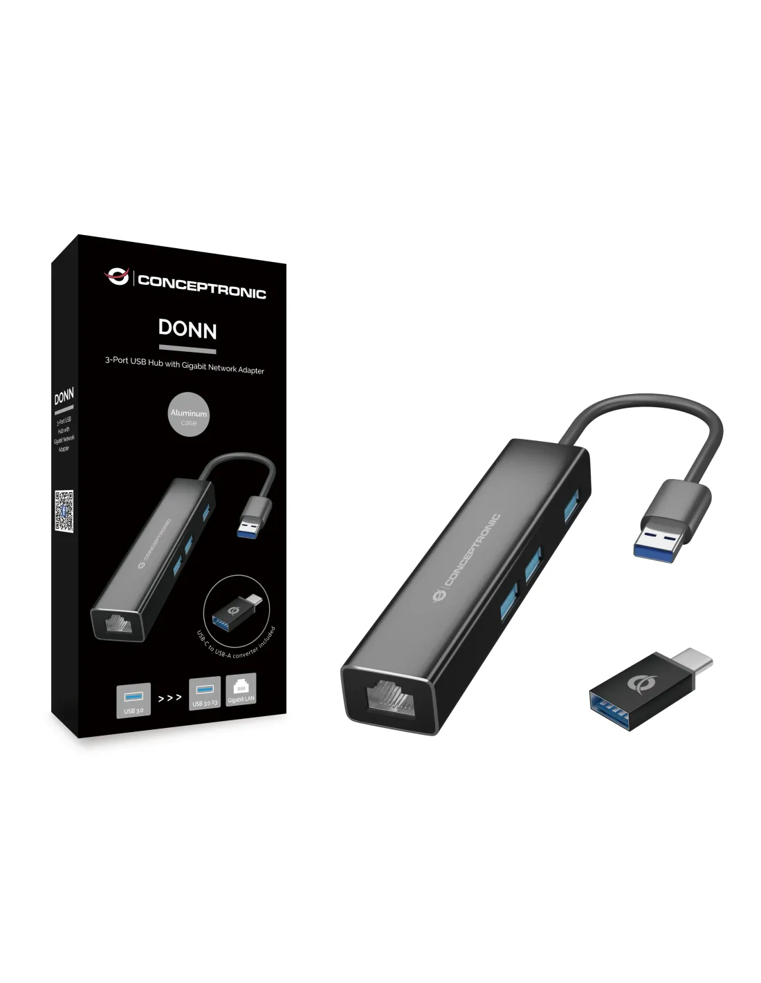 Conceptronic DONN07BA, USB 3.2 Gen 1 (3.1 Gen 1) Type-A, 10,100,1000 Mbit/s, Negro, RJ-45, USB 3.2 Gen 1 (3.1 Gen 1) Type-A, Aluminio, China