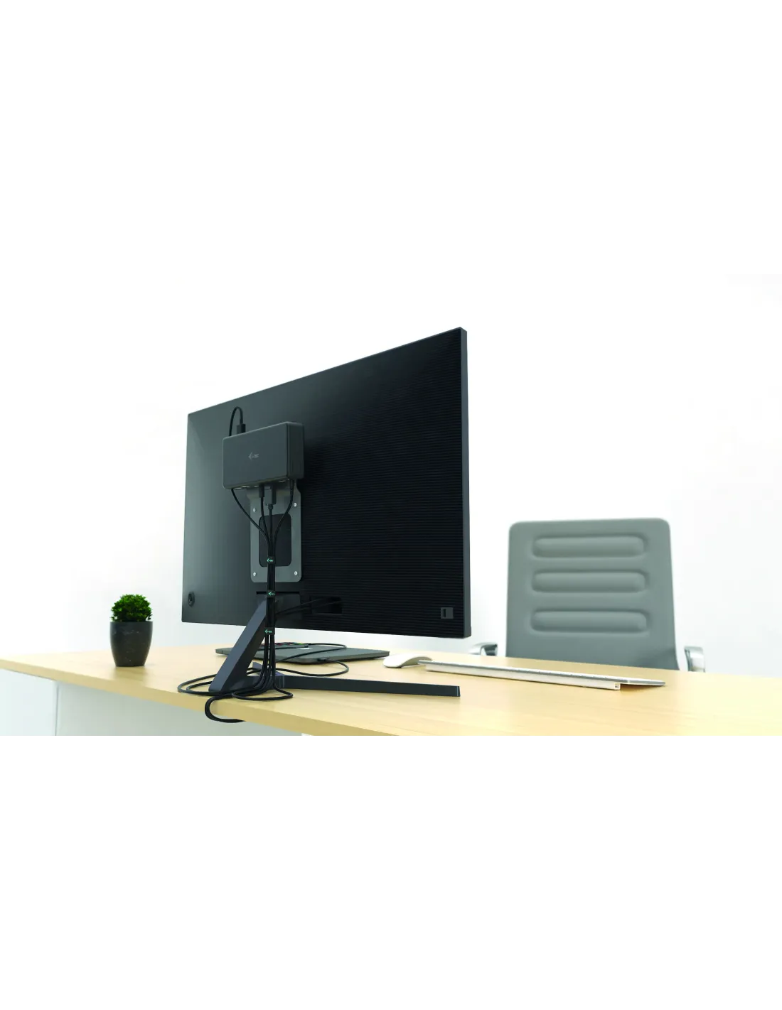 Un diseño de escritorio cómodo, limpio y eficiente es una parte integral de la oficina moderna. Gracias al uso inteligente del estándar VESA puede organizar su escritorio mucho mejor y aumentar efectivamente el área de su entorno de trabajo. Al colocar la estación de acoplamiento (y los cables) detrás del monitor, no solo aumentará la comodidad sino también minimizará el riesgo de robo.